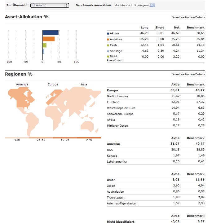 Warambuffet Mai 13, 2015 Sind diese Fondsanteile denn öffentlich handelbar (ISIN?). Dann könnte man sich ggf. selbst einen Überblick verschaffen: Morningstar Instant X-Ray http://www.morningst...ay/default.aspx Ich würde mindestens die Aufteilung von riskanten zu risikoarmen Anlagen wissen wollen. Es handelt sich fast ausschliesslich um die bekannten und auch hier diskutierten Mischfonds, von denen viele die Aktienquote jederzeit in großen Bereichen verändern können. Danke für den x-ray Hinweis, das werde ich mal ausprobieren. Diesen Beitrag teilen Link zum Beitrag