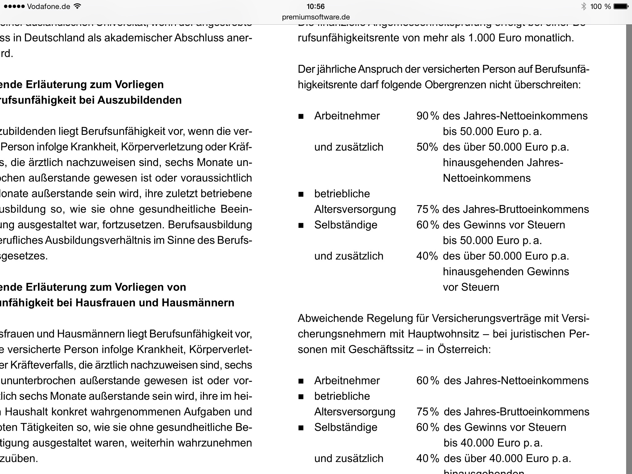 Matthew Pryor Juni 13, 2015 · bearbeitet Juni 13, 2015 von Matthew Pryor Die Conti hat ab 1.000 Euro BU Rente eine Angemessenheitsprüfung. Und Selbstständige können nur 60 % des Gewinns vor Steuern bis 50.000 Euro p.a. und 40 % des darüber hinausgehenden Teils versichern. Kurz eingehakt:Es sind 50% des Gewinns vor Steuern,darüber hinaus 35%.50.000€ passt.Ich glaube,du hast zu früher Stunde die Regelungen für Versicherungsnehmer mit Hauptwohnsitz in Österreich mit verquickt ... Mitteilungspflichten des VN im Leistungsfall, schlechtmöglichste (oder) Regelung am Markt Da bin ich anderer Meinung.Bei einer Aufzählung ist "sowie" einem "und" gleichzusetzen.Heißt im Umkehrschluss,dass beide Ereignisse zusammentreffend eine Mitteilungspflicht auslösen würden,nicht aber jedes der genannten Ereignisse (Minderung bzw. Wiederaufnahme der beruflichen Tätigkeit) für sich genommen. Die AL hat hier die klar bessere Regelung für Humanmediziner (+Zahn) und Studenten der Humanmedizin (+Zahn): Eine Leistung ist auch ohne vollständiges, behördlich angeordnetes Tätigkeitsverbot möglich. Prinzipiell ja.Da wäre es interessant,was für die AL "objektive Kriterien" im Zweifelsfall meint.Aber grundsätzlich ist die Regelung besser,weil für den Versicherten zumindest eine Hintertür offen gelassen wird,wenn kein vollständiges Verbot vorliegt. Diesen Beitrag teilen Link zum Beitrag