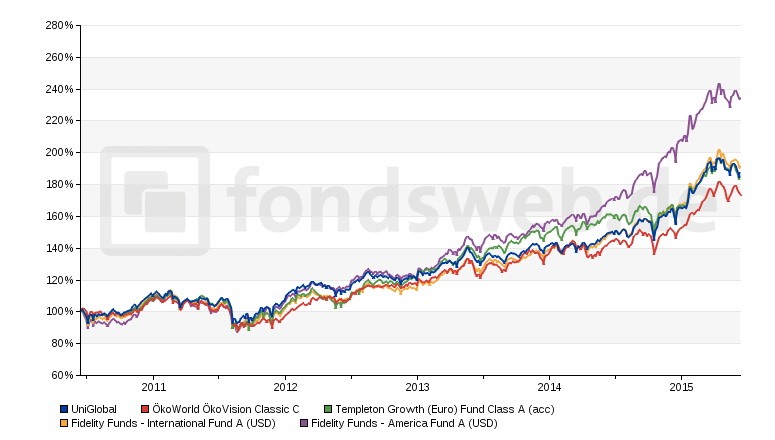 moonraker Juni 14, 2015 Hallo, habe mal die Fonds bei fondsweb schrittweise verglichen, dabei optisch nach der 5-Jahres-Performance ausgewählt und bin bei folgenden 5 Fonds gelandet: http://www.fondsweb....97-LU0048573561 Die globalen Fonds sind auf 5 Jahre recht ähnlich, wobei der ÖkoVision schon 10% hinterherhängt. Der Fidelity Amerika ist am besten gelaufen (über 1/3/5/10 Jahre), wäre mir als alleinige Auswahl aber zu einseitig - lieber Welt (was Du ja wolltest). (Ähnlich gut hätte sich übrigens auch noch der Fidelity Germany entwickelt, wäre mir aber ebenfalls zu speziell.) Mit dem Uniglobal machst Du m.M.n. wenig falsch. Der Fidelity International lief die letzte Zeit besser, vielleicht könnte man da auch bei mischen (oder sogar noch mit Templeton Growth) Diesen Beitrag teilen Link zum Beitrag