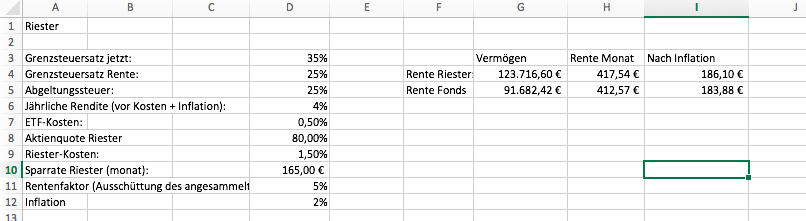 moonraker Juli 21, 2015 · bearbeitet Juli 21, 2015 von moonraker Ein paar Änderungsvorschläge: Beim Ertrag kann man noch die halbe Sparrate des laufenden Jahre mitverzinsen (entsprechend auch Kosten anpassen) Die Aktienquote Riester ist wahrscheinlich nicht konstant - kann am Anfang durchaus 100% betragen und die letzten 10 Jahre absinken (je nach gewähltem Produkt) Man sieht nachfolgend, dass durch Variation der Parameter die Ergebnisse z.T. erheblich beeinflusst werden, besonders von Aktienquote Riester (s.o.) Wertenwicklung Aktien (4% - 5% - 6% - 8%??) - je höher, desto besser für die Riestervariante (Kostenunterschied wird kleiner) Anteil am ETF-Gewinn, der im gleichen Jahr mit 25% versteuert wird (gilt ja nicht für Kursgewinne - muss aber am Ende wieder rausgerechnet werden...) Leider sind die genauen Zahlen hierfür u.U. nicht 100%ig planbar. Damit kann dann auch keine endgültige Aussage getroffen werden. Für mich kommt bei dieser Abschätzung aber immer Riester besser weg (ca. 1% bis zu 20%) Diesen Beitrag teilen Link zum Beitrag