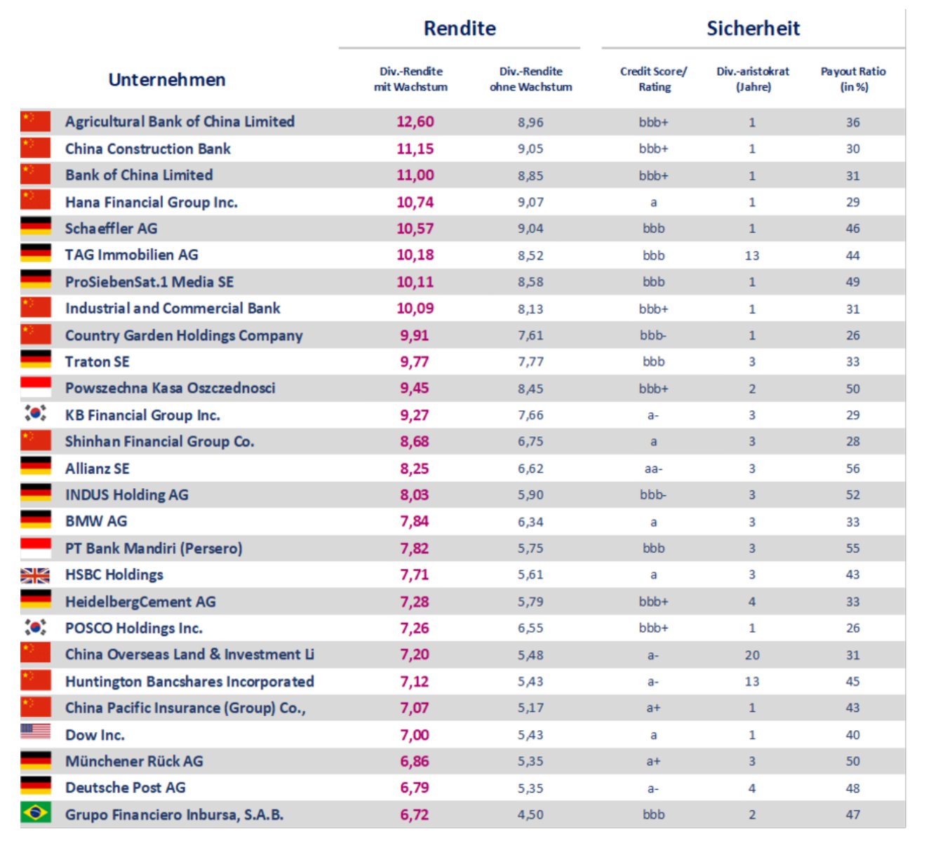 und DGI, wo man nicht nur auf die aktuellen Dividendenrenditen schaut, sondern auch auf die (zumindest vergangene, möglichst langfristige) positive Geschäftsentwicklung, also das Wachstum von Gewinnen und Cashflows.