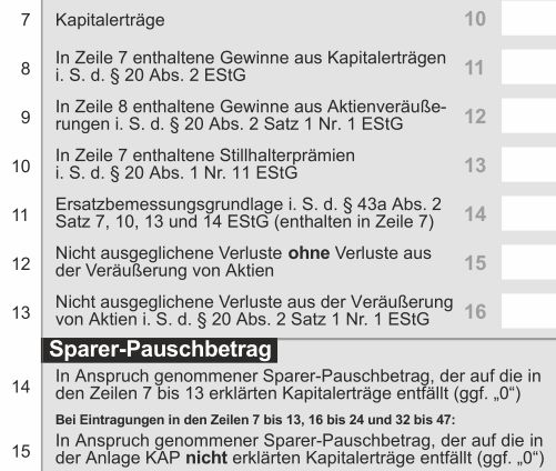 boll Juli 31, 2015 · bearbeitet Juli 31, 2015 von boll Zeile 7 Anlage KAP: Kapitalerträge € 17.028 Zeile 8 Anlage KAP: darin enthaltene Gewinne aus Aktienveräußerungen i.S. d. § 20 Abs. 2 Satz 1 Nr. 1 EStG: € 16.439 Zeile 14 Anlage KAP: nicht in Anspruch genommenener Sparerfreibetrag: € 562 Zeile 7 = Alle Kapitalerträge, d.h. aus Zinsen, Ausschüttungen, aber auch Gewinne aus der Veräußerung von Fonds, Anleihen (inkl. Stückzinsen), Aktiengewinne, ... Zeile 8 = Kapitalerträge aus der Veräußerung von Fonds, Anleihen (inkl. Stückzinsen), Aktiengewinne, ... Zeile 9 = Kapitalerträge aus der Veräußerung von Aktien Deine Zeile 8 enthält Gewinne aus Aktienveräußerungen? Zeile 14 = nicht Anspruch genommener Sparer-Pauschbetrag? Diesen Beitrag teilen Link zum Beitrag