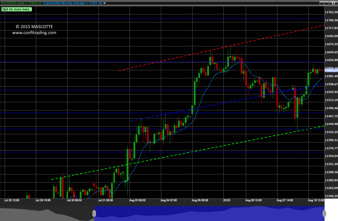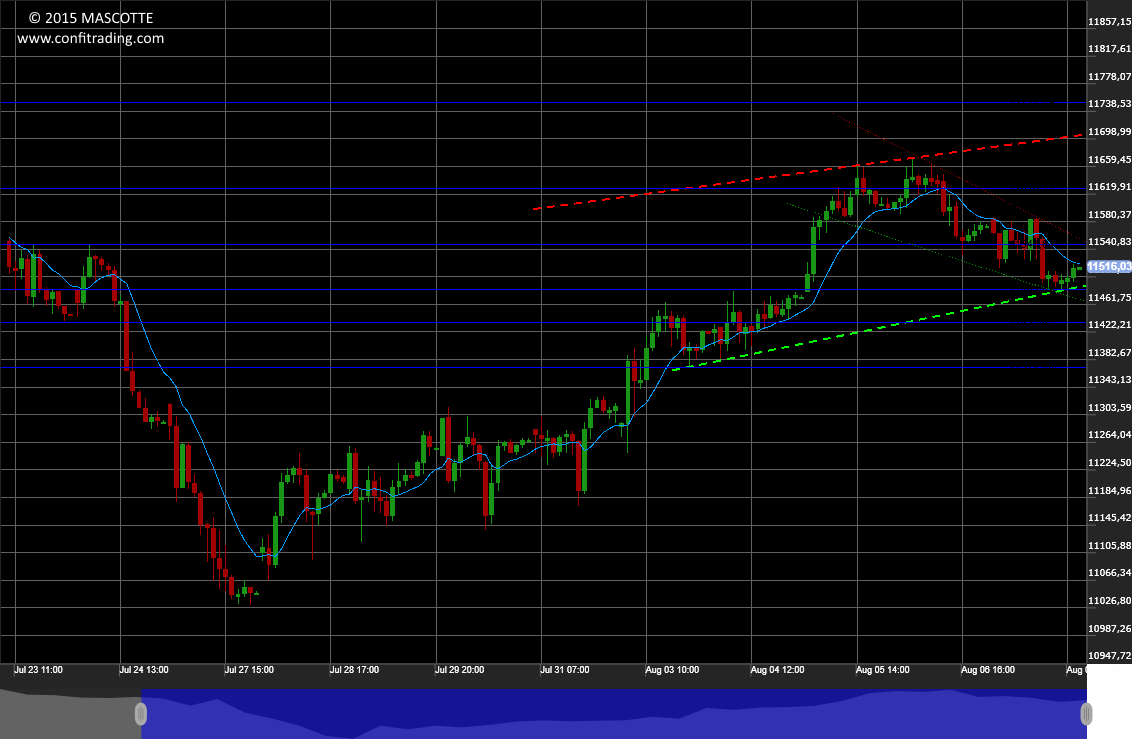 Der Kurs hatte heute mit Up-Gap eröffnet, damit hatte ich nicht gerechnet. Und dennoch fiel der Kurs wie erwartet bis 11435 und konnte dann fast die 11630 erreichen. An dieser Marke wird es morgen spannend, sie wird die morgige Richtung bestimmen.