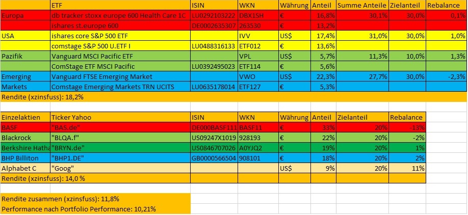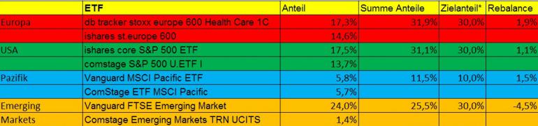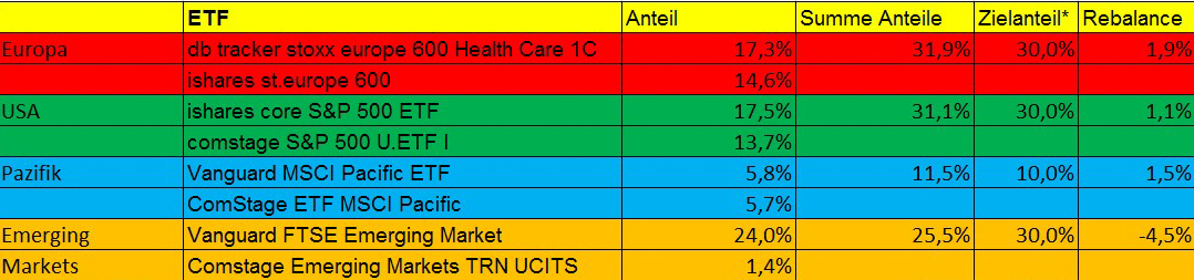 Supertobs hat ja dann auch begonnen Einzelaktien zuzumischen (hier). Da ich auch ganz gerne den Markt verfolge und gerne die ein oder andere Aktie besitze mache ich dies als Ergänzung ebenfalls. Ich will damit keinen Index schlagen und mache die Einzelaktien nur aus Spaß an der Freude. Momentan macht das auch nur 6% des Gesamtvolumens aus. Einzelaktien würde ich dann im Rahmen des Rebalancing soweit möglich dem entsprechenden Region (Europa/USA/Pazifik/EM) zuordnen.