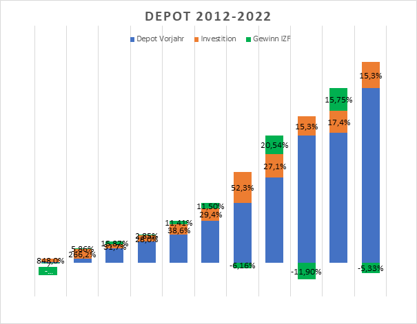 Mojo-cutter Dezember 30, 2022 · bearbeitet Januar 20, 2023 von Mojo-cutter Fehler in der Berechnung behoben, Grafik AA neu geladen The Good, the Bad and the Ugly 2022 The Good: Im Anleihenbereich meine Perle, die NLB8B3, Zinskoupon auf Grund des €/$-Kurses noch mehr zu meinen Gunsten. Neu AAA-Anleihen, bewußt in €: eine deutsche inflationsindexierte Staatsanleihe (103056) und Pfandbrief (BLB6JT) zur Glättung der Depot-Kursschwankungen. Geplant, sobald das Geld zusammen ist, die IKB Anleihe A2GSG2, eine der wenigen die als Privater in der Stückelung zu kaufen ist und auf Grund dessen einen gewissen Renditevorteil bietet. Unterm Strich haben die Anleihen ca. 4% in 2022 gebracht. Das ist mir für das Risiko, das ich eingegangen bin zu wenig, deshalb weg mit dem Risiko (Mittelstandsanleihen) und mehr IG-Anleihen. Im Aktienbereich bleibt es bei kontinuierlicher Aufstockung der A2PKXG. Ein Zock, der aufging: Meine Spielerei mit CO2-Zertifikaten (CU3RPS). Keine Gebühren beim Handel, hohe Volatilität. Geht es runter bleibt, es im Depot als Beimischung. Geht es gegenüber Einstandskurs um ca. 10% hoch, wird verkauft. Geht nur mit Geld, das man nicht braucht. Für mich überschaubares Risiko. Allerdings eine Black Box, welche sehr von der Politik abhängig ist. Langfristig geht es aber eher hoch (meine Meinung). The Bad: Krypto war ein Spiel, dass erst mal nicht aufgegangen ist. Das war in der Kalkulation des Zocks (nichts anderes ist das) mit drin. An die Technologie hinter den Kryptos (v.a. Blockchain) glaube ich unverändert. Ob man damit Geld verdienen kann, wird man sehen. Ich bleibe dabei, vielleicht kaufe ich auch ab und zu mit kleinem Geld in den nächsten Jahren nach und dann schaue ich mal ob in 10 Jahren noch was da ist. Sollte es mal wieder einen Run auf Kryptos in der Zwischenzeit geben werde ich, so es denn Gewinne gibt, diese auch mitnehmen (hoffentlich dann noch steuerfrei – das Steuergesetz ändert sich ja gerne zu Ungunsten des zu Besteuernden). Falls es interessiert, der Anteil an Kryptos am Gesamtdepot war zu Hochzeiten ca. 4% und jetzt noch 1,3% Mittelstandsanleihen aus Deutschland waren wieder mal eher schrottig, die Monaco-Gruppe belastet mehr, als dass sie was abwirft. Hier bin ich weiter am Reduzieren, wie bereits letztes Jahr angekündigt. The Ugly: Gesamtperformance 2022 (nach Portfolio Performance. Deshalb etwas ungenau, da Anleihen nicht ganz korrekt abgebildet werden. Die Richtung stimmt aber gut): IZF: -10,5% (krasser Fehler im Datenimport in PP hatte zu fehlerhafter beschönigter Berechnung von -5,5% geführt, gleiches für TTWROR) TTWRoR: -10,6% Max. DD: 11,5% Eigentlich finde ich die Performance gar nicht so hässlich, ich bin zufrieden. Trotzdem hätte ich nächstes Jahr gerne wieder ein Plus vor der Zahl. In diesem Sinne, allen ein gutes Neues Jahr und viel Erfolg beim Investieren. Depotentwicklung über die Jahre Asset Allokation (jetzt auch lesbar) Diesen Beitrag teilen Link zum Beitrag