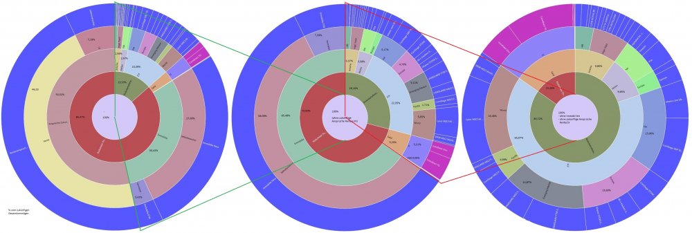 Das erste Tortendiagramm zeigt das Gesamtvermögen an, wenn ich die zukünftigen Rentenansprüche und LVs mit den aktuell vorhandenen Immobilien und Aktien/ETF/Anleihen/TG. Daraus (mit grünen Strichen) das zweite Diagramm mit den aktuell vorhandenen Immobilien und Aktien/ETF/Anleihen/TG und daraus (rote Striche) im dritten Diagramm nur Aktien/ETF/Anleihen/TG.