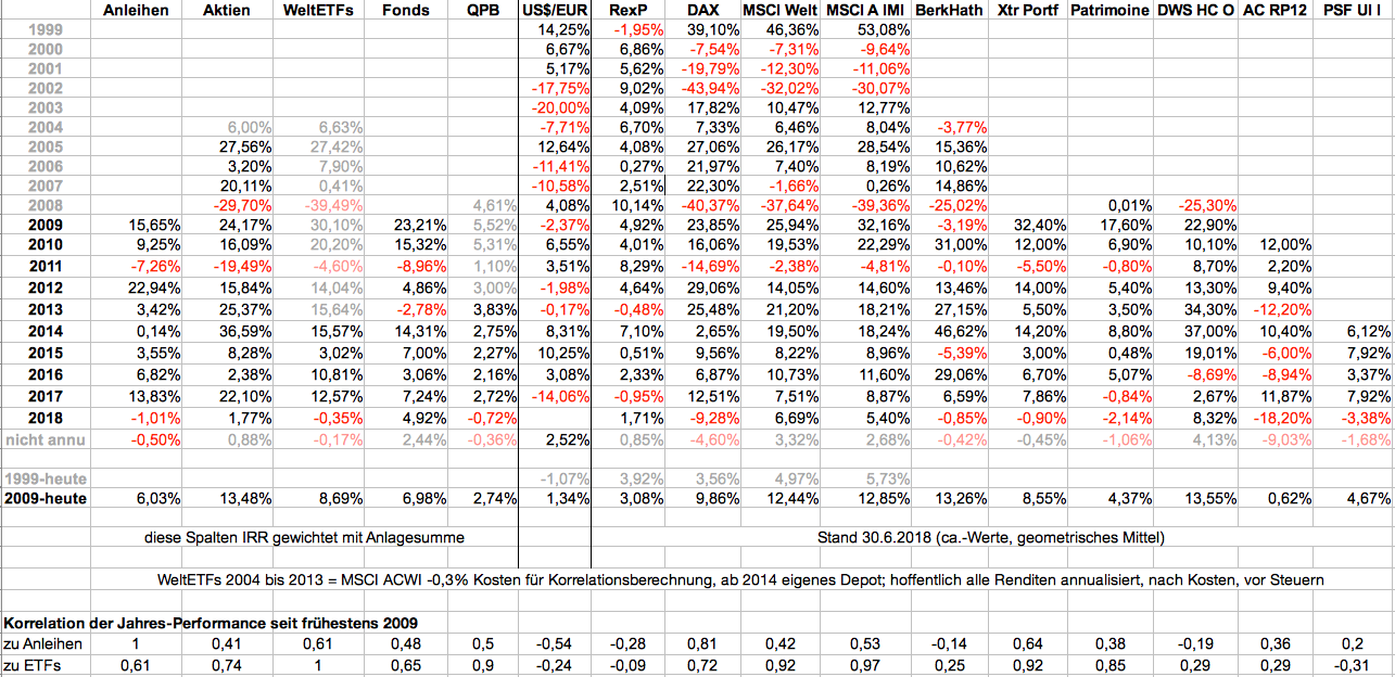 Ramstein September 29, 2018 · bearbeitet September 29, 2018 von Ramstein 30. September 2018 Wieder ein Quartal vorbei und Zeit für den Überblick. Neu ist die Korrelationszeile zum RexP; endlich mal negative Korrelationen. Das Hirnrissdepot (je 1/3 Fonds von Dirk Müller und Max Otte und Bitcoins) ist auch wieder dabei, nachdem ich auf ein anderes Bitcoinprodukt umgestellen konnte (das alte war nicht mehr im Angebot). Meine Anleihen laufen dieses Jahr schwach, ETFs mäßig, meine Aktien gut. Insgesamt eine Verbesserung gegenüber den vorherigen Quartalsabschlüssen und es ist ja noch ein Quartal bis Jahresende und vielleicht kommen auch die Anleihen wieder. Diesen Beitrag teilen Link zum Beitrag