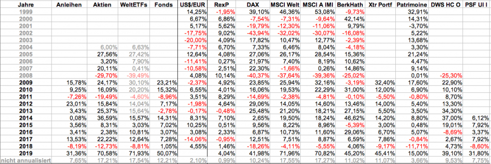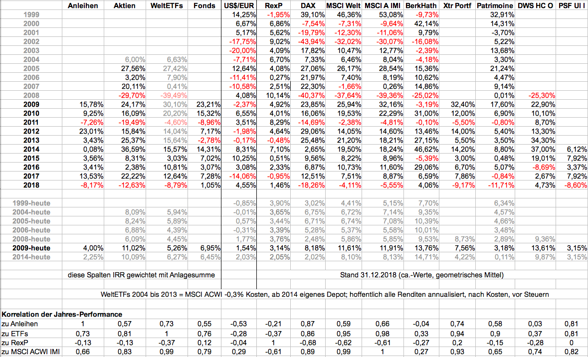 Ramstein Januar 1, 2019 · bearbeitet Januar 1, 2019 von Ramstein kleine Korrektur am Spreadsheet 31.12.2018 2018 war nicht gerade ein Superjahr. Eigentlich war es sogar schlecht. Schlechter als 2011, aber immerhin deutlich besser als 2008. Man hätte nicht breit diversifizieren, sondern Berkshire Hathaway kaufen sollen. Das wäre auch über die letzten 20 Jahre die bessere Alternative gewesen. Man sieht auch, dass HY-Anleihen performance-mäßig stark an der Marktentwicklung hängen. Aber die Zinserträge stellen sicher, dass keine Aktien verkauft werden müssen, um den Liquiditätsbedarf zu decken. 2019 wird natürlich(?) alles besser. Wer bis dahin Trost braucht: Hier ein paar aufmunternde(?) Zitate: Börsengewinne sind Schmerzensgelder. Erst kommen die Schmerzen, dann das Geld. André Kostolany Anfangen im Kleinen, Ausharren in Schwierigkeiten, Streben zum Großen. Friedrich Alfred Krupp Ungleichheit ist nicht bedauerlich, sondern höchst erfreulich. Sie ist einfach nötig. F. A. Hayek When you're born into this world, you're given a ticket to the freak show. If you're born in America you get a front row seat. George Carlin Nachtrag: Diesen Beitrag teilen Link zum Beitrag
