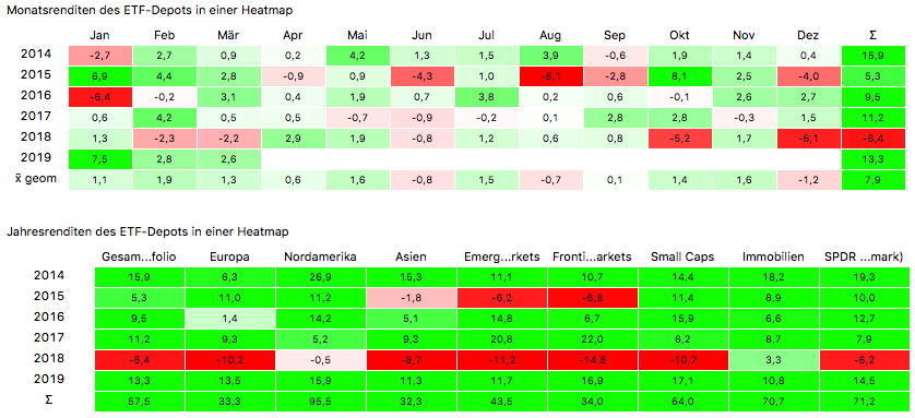 Ramstein April 1, 2019 Stand 31. März 2019 Das erste Quartal war überaus erfreulich an allen Fronten. Bei Einzelaktien und ETFs bin ich ungefähr auf Indexniveau, die aktiven Fonds nicht ganz so stark, aber da sind ja auch Immobilien und Anleihen mit drin, sodass letztes Jahr noch eine kleine positive Rendite kam. Auch die Anleihen konnten trotz Venezuela, HSH und MiFID eine solide Performance hinlegen. Jetzt noch einige Auswertungen aus Portfolio Performance: Mein Aktiendepot lief die letzten Jahre besser als der Index. Beim ETF-Depot sieht man, dass die Immobilien (iShares Dev Countries Property Yield und Wertgrund Wohnselect) stabile Erträge brachten. Nordamerika war der Top-Performer, Europa und Asien vergleichsweise schwach. Wenn es so weiter geht: super. Wenn der Rest des Jahres +-Null läuft: kein Problem. Diesen Beitrag teilen Link zum Beitrag