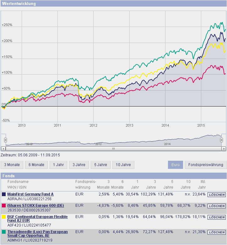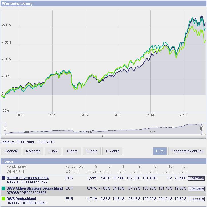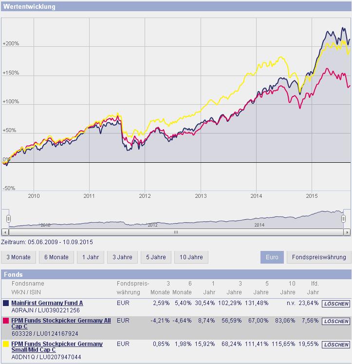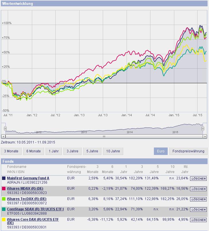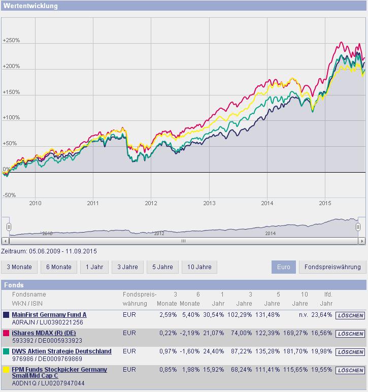 ghost_69 September 12, 2015 MainFirst Germany Fund A Anlagestrategie Der Fonds investiert in Aktien jeder Marktkapitalisierung, Standardwerte machen jedoch stets mindestens 50% des Fonds aus. Je nach Marktlage werden Nebenwerte nach fundamentalen Kriterien beigemischt, die für das Zusatz-Alpha zuständig sind. In schwachen Börsenphasen wird der Fonds von Bluechips dominiert. Der Investmentprozess zeichnet sich durch eine stringente Risikokontrolle und aktiven Management-Ansatz aus. Basisdaten WKN / ISIN: A0RAJN / LU0390221256 Fondsgesellschaft MainFirst SICAV Fondsmanager Herr Peter Ott Anlageregion Deutschland Fondskategorie Aktienfonds Asset-Schwerpunkt All Cap Fonds-Benchmark 100% HDAX TR EUR Risikoklasse 3 Risiko-Ertrags-Profil (SRRI) 6 Fondsvolumen 87,71 Mio. EUR (alle Tranchen) Auflegungsdatum 05.06.2009 Ertragsverwendung thesaurierend Steuerstatus transparent Geschäftsjahr 1.1. - 31.12. Kauf / Verkauf Ja / Ja Spar- / Auszahlplan Ja / Ja Vermögenswirksame Leistungen nicht möglich Kosten und Gebühren Ausgabeaufschlag (effektiv) 5,00% (4,76%) Depotbankgebühr p.a. 0,05% Managementgebühr p.a. 1,50% Performancegebühr 15,00% der Outperformance über HDAX TR (net), High Watermark Gesamtkostenquote (TER) 2014 2,55% Warum stelle ich diesen Fonds vor ? Weil er in der Homebasis anlegt, er mehr als nur den DAX investiert, Deutschland langfristig gut für eine Aktienanlage ist und es andere Fonds gibt, die aber in letzter Zeit nicht so gut waren wir dieser hier und das ich Europa und auch Deutschland eine bessere Entwicklung zutraue als den USA in den nächsten mittelfristigen Jahren. Vergleich man diesen Fonds mit den Gängigen von der DWS dann liegt er knapp vorne, aber die Jungs der DWS haben mehr Schwergewichte aus dem DAX dabei. Vergleich man den Fonds mit den von FPM dann liegt er auch vorne: Nimmt man jetzt noch die DAXe als Vergleich hinzu, da ich die ETFler trapsen höre ist der MDAX und der TecDAX sehr interessant und der MDAX wohl die bessere Wahl. So und hier nun die besseren Deutschlandfonds: Jetzt haben wir's der MDAX sieht im Chart am besten aus, rein vom Gefühl würde ich den FPM vorziehen, die Frage ist, was passiert in der nächsten Krise, kann der Fonds von MainFirst rechtzeitig umschichten oder geht er sogar in Cash, dann ist dieser die bessere Wahl. oder ist es besser gleich ganz Europa ins Depot zu holen ? Fragen über Fragen ! Ghost_69 :- Diesen Beitrag teilen Link zum Beitrag