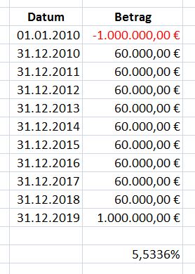 Nehmen wir folgendes Beispiel (Gebühren und Steuern außen vor gelassen): Ich kaufe am 01.01.2010 ein Haus für 1.000.000€ und vermiete das jährlich. Meine Mieteinnahmen sind 60.000€. Am 31.12.2019 verkaufe ich das Haus wieder für 1.000.000€ (Einkaufspreis = Ausgleichspreis). Logischerweise beträgt meine jährliche Rendite jedes Jahr immer genau 6,00 %.