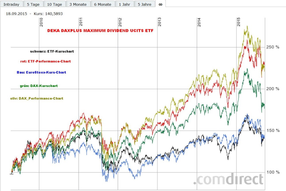 Wil-helm September 20, 2015 Falsch. Thesaurierer oder Ausschütter? Eine Glaubensfrage? Eine Frage der Psychologie? Ist es nicht auch eine Frage der individuellen Zielsetzung? Ich, 73, z.B. hatte vor dem Verkauf einer vermieteten Immobilie eine Netto-Mietzinsrendite von ca. 5% (1000€ pro Monat), die ich sehr gut gebrauchen konnte. Jetzt möchte ich den Verkaufserlös in Wertpapiere (ETF-Diversifikation) anlegen - um möglichst bei Erhaltung der Substanz von den Zinsen/Kapitalertrag zusätzlich leben zu können. Ok? Bei ETFs auf den DAX oder EuroStoxx beträgt die Rendite ca. 2,5 -3,2%. Bei den "Select Dividend-ETFs liegt sie bei ca. 3,5 - 4,5%. Dafür liegt der Kurschart aber auch deutlich unter dem EuroStoxx-Kurschart. Ein besonderes Beispiel ist der ETF "DEKA DAXPLus Maximum", DE000ETF235, der in den letzten 6 Jahren ca. 5,5 - 7,8% ausschüttete. Sein Kurschart (schwarz, s. Abbildung) liegt deutlich unter dem DAX-Kurschart (grün), etwa gleichauf mit den EuroStoxx (blau). Der ETF-Performance-Chart (rot) kommt allerdings durchaus dem DAX-Performance (oliv) nahe. Was meint ihr? Eine dicke Rendite unter Verzicht auf große Kursgewinne? Oder wo liegt der Pferdefuß? Diesen Beitrag teilen Link zum Beitrag