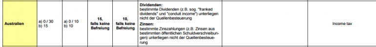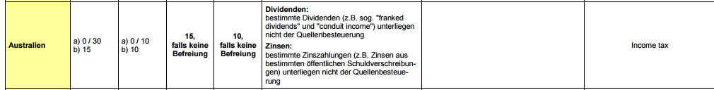 So unterliegen bestimmte Dividenden, wie „franked dividends“ und „conduit income“ nicht der Quellenbesteuerung.Das „conduit foreign income“ (CFI) beschreibt ausländisches Einkommen, welches man über eine oder mehrere zwischengeschaltete australische Kapitalgesellschaften erhält.