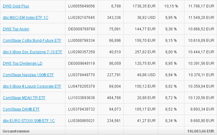 vanity Oktober 4, 2016 So läuft es besser - ganz ohne Opportunities, egal ob multiple oder bantiple! Stand 30.09.2016 Deka DAX® (ausschüttend) -3,26% Deka MSCI Europe -4,22% Deka MSCI USA +2,37% Deka MSCI Japan -0,26% Deka MSCI Emerging Markets +11,09% Deka Deutsche Boerse EUROGOV® Germany 10tto221 +17,33% Deka Deutsche Boerse EUROGOV® France +3,43% Deka iBoxx EUR Liquid Sovereign Diversified 1-3 +0,50% Deka iBoxx EUR Liquid Sovereign Diversified 3-5 +2,09% Deka iBoxx EUR Liquid Germany Covered Diversified ETF +2,56% Deka iBoxx EUR Liquid Corporates Diversified +6,02% Summe Portfolio +3,42% Diesen Beitrag teilen Link zum Beitrag