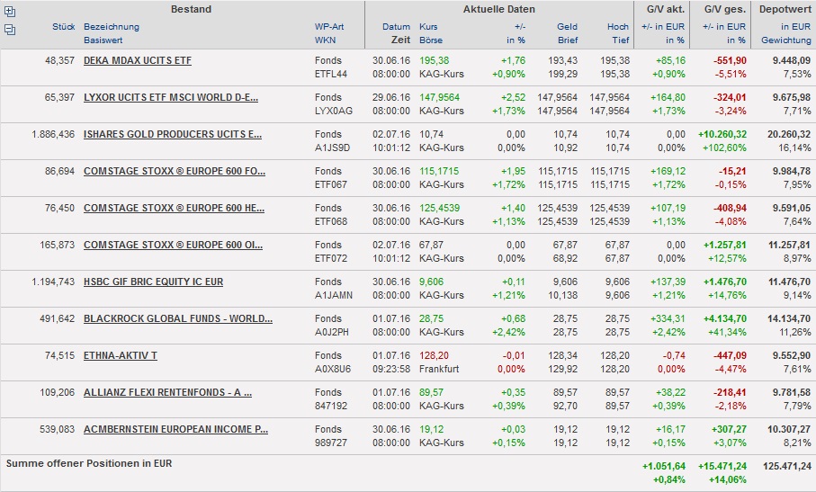 vanity Juli 30, 2016 · bearbeitet August 1, 2016 von vanity Daten per 29.07. Fragen, die die Welt bewegen: Wird H. seinen Kombiqwatsch jetzt zu Beginn dieser Seite oder erst im noch zu ergrätschenden ersten Beitrag der nächsten Seite präsentieren? Eine weitreichende Entscheidung, der er hoffentlich gewachsen ist. Im ersten Fall darf weiterhin munter drauflos gepostet werden, andernfalls muss Threaddisziplin gewahrt werden (ius primae postae lepori). Stand 28.07.2016 Deka DAX® (ausschüttend) -5,40% Deka MSCI Europe -5,47% Deka MSCI USA +3,10% Deka MSCI Japan -4,07% Deka MSCI Emerging Markets +8,54% Deka Deutsche Boerse EUROGOV® Germany 10tto03+ +17,88% Deka Deutsche Boerse EUROGOV® France +3,21% Deka iBoxx EUR Liquid Sovereign Diversified 1-3 +0,46% Deka iBoxx EUR Liquid Sovereign Diversified 3-5 +1,94% Deka iBoxx EUR Liquid Germany Covered Diversified ETF +2,44% Deka iBoxx EUR Liquid Corporates Diversified +5,94% Summe Portfolio +2,59% (mit Ultimo-Daten vermutlich ein paar Hundertstel weniger mehr) +2,88% Diesen Beitrag teilen Link zum Beitrag
