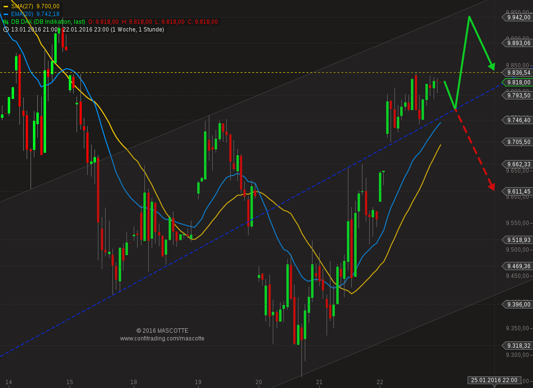 Der Aufwärtstrend nach der Trendwende am Mittwoch hat sich bestätigt und der Kurs sollte Montag oberhalb der blauen Mittelachse verbleiben. Im Wochenverlauf kann dann die 10000 zurückerobert werden. Und dennoch: einige Banken in Europa haben mit "faulen Krediten" zu kämpfen und auch in Syrien können einige Überraschungen auf uns warten. Allein das billige Öl wird den Dax nicht wieder nach unten reißen... wir werden sehen...