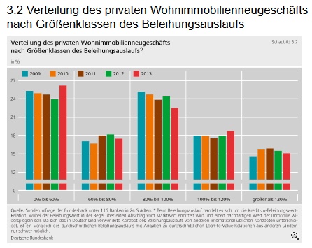 qwerty Februar 9, 2016 · bearbeitet Februar 9, 2016 von qwerty Kann ich mir beim besten Willen nicht vorstellen, was man indirekt aus den Äußerungen der Bundesbank ableiten kann. So sagte die Bundesbank, dass sie die zunehmende Geschäftspraxis der Vollfinanzierungen im Immobilienbereich kritisch beurteile. Alleine daraus kann man schließen, dass durch die vermehrten Neuabschlüsse in dem Bereich mit sinkenden Eigenkapitalquoten im Schnitt bei der Immobilienfinanzierung von auszugehen ist. Schade, dass du dazu nicht mehr findest. Ich habe bei der Bundesbank jetzt diesen Beitrag gefunden. Aus der Grafik geht hervor, wie die Immobilienpreise in den vergangenen Jahren gestiegen sind. Auch wenn die Grafik die Daten schlecht aufbereitet. Hier kann man die Verteilung des privaten Wohnimmobilienneugeschäfts nach Größenklassen des Beleihungsauslaufs ablesen. Ist leider nicht ganz aktuell (neuste Zahlen aus 2013). Die Grafik habe ich angehängt. Daraus lese ich jetzt keine beunruhigende Steigerung hoher Beleihungen ab. Weiter unten bei "Zeitreihen des Finanzstabilitätsberichts 2014" kann man sich die Daten auch tabellarisch ausgeben lassen. Ein Gedanke noch: Wenn die Leute – so wie die Eltern das auch schon gemacht haben – weiter mit zwei Prozent tilgen, können sie sich momentan mehr Geld leihen bei gleichem "gefühltem Komfort". Vielleicht steigt auch deshalb die Beleihung, wenn sie denn steigt. Edit: Das Anhängen der Grafik gelingt mir nicht. Findet sich aber wie geschrieben hinter dem zweiten verlinkten "hier". Diesen Beitrag teilen Link zum Beitrag