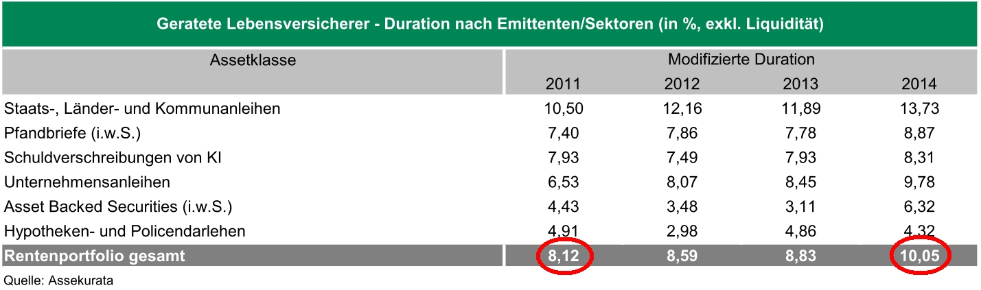 - Sie erhöhen in der Niedrigzinsphase die Duration ihrer Anlagen (also sie locken die niedrigen Zinsen für länger ein) um ihre Risiken aus den langfristigen Zahlungsverpflichtungen zu reduzieren. Siehe Assekuranta: