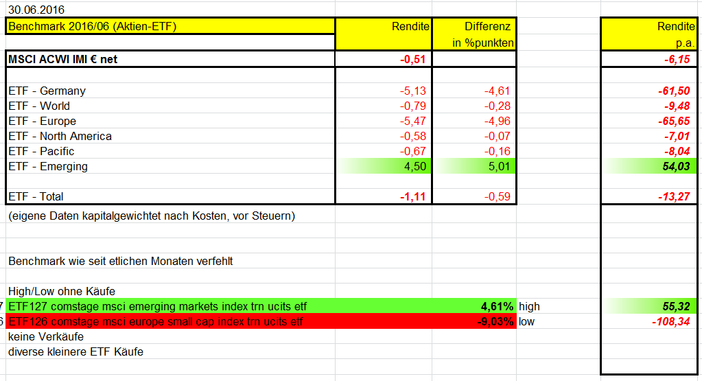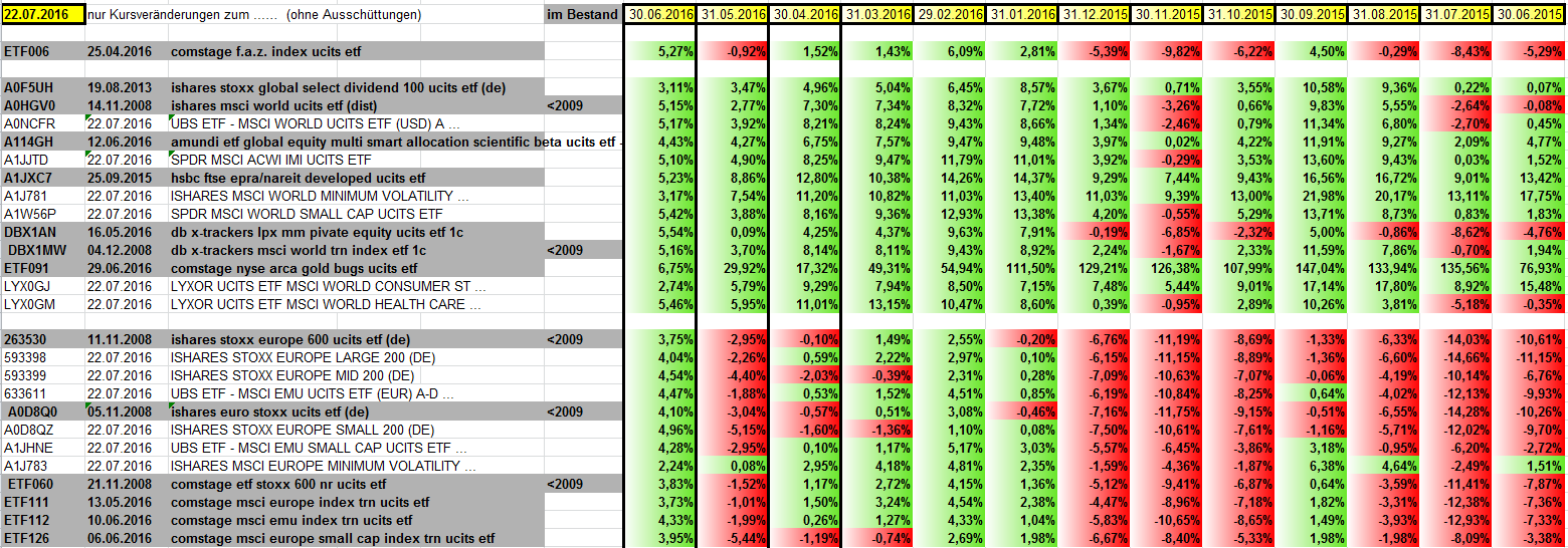 Bis auf wenige Ausnahmen (MinVol, Arca, Consumer, S&P small) und alle beobachteten Emerging Markets sind alle anderen ETFs in diesem Monat sanft errötet.