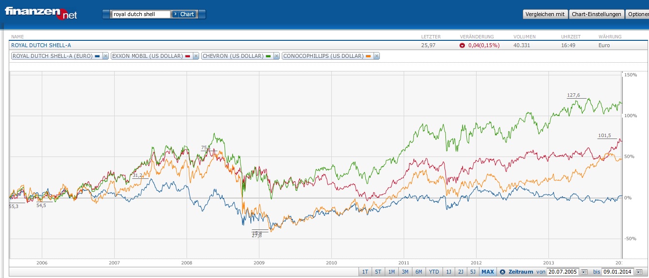 35sebastian Januar 9, 2014 Also ich hätte da - z.B. gemessen am amerikanischen "Big Oil" - gewisse Vorschläge.... :- Du machst es ja nett mit deinen Vorschlägen. Aber was bringen historische Chartvergleiche für eine Investition in die Zukunft? Sicherlich sind die Kurse von Chevron in den letzten Jahren besser gelaufen als z.b. RDS. Soll man deiner Ansicht nach jetzt RDS verkaufen und dafür Chevron kaufen? Im Nachhinein kann man auch immer schön mit den Zeiträumen "spielen". Nimm einfach mal den 10, 15 Jahresvergleich. Dann verschieben sich wahrscheinlich die Chartlinien. Ich habe meine erste Position in RDS vor über 10 Jahre gekauft. Gewinn ohne Dividende :50%. Dividendenzahlung versteuert ca. 30% +. Hätte ich vor 10 Jahren oder vor 7 oder.... Jahren die jetzige Erkenntnis gehabt, hätte ich sicherlich nur auf Chevron gesetzt. Da ich aber keine hellseherischen Gaben habe, habe ich das Risiko auf verschiedene Unternehmen verteilt. auf RDS eben, Exxon, Conoco, Total und zwischendurch auf Statoil und Petrochina. Und ich habe nie nach guter , sondern nach schlechter Performance gekauft. Deshalb steht RDS immer noch für einen Nachkauf im Fokus. Diesen Beitrag teilen Link zum Beitrag