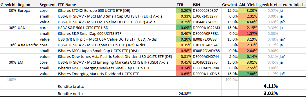 Small Caps mussten entfallen wegen zu geringer Yields. Einen REIT-ETF (A0LGQL) würde ich wahrscheinlich noch dazu nehmen. Das habe ich aber hier mal ausgelassen, damit es nicht zu komplex wird.