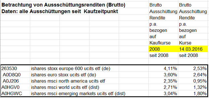 Auch klar ist doch folgendes. Wenn ich mit der Ausschüttungsquote eines ETFs rechne, dann arbeite ich mit vergangenen Daten. Niemand kann die Aktien- und Wechselkurse voraussagen. Man kann nur mit gewissen Annahmen arbeiten und genug Sicherheitsreserven einbauen.