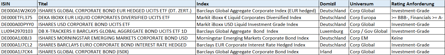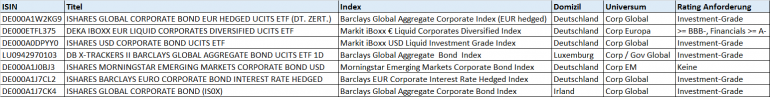Leonhard_E März 16, 2016 · bearbeitet März 16, 2016 von Leonhard_E Mich wundert gerade, dass es keinen Forenstandard für den risikoärmeren Portfolio Anteil zu geben scheint. Gleich vorweg: Ich habe gesucht, ich habe nichts gefunden, wenn es etwas gibt, bitte um Vergebung. Einleitung: Im Fonds-Forum gibt es zahlreiche Kochrezepte wie man ein Aktien - ETF Portfolio aufbauen kann abhängig von der Anlagesumme. Inzwischen haben sich dort sogar zahlreiche Foren-Standards etabliert (mit 2,3,4, 6 ETFs) und es gibt sogar konkrete Analysen dabei, welche ETFs gerade besonders geeignet sind (der legendäre Holzmeier Thread). Gleichwohl scheinen auch viele der Meinung zu sein, dass ein 100% Aktien Portfolio keine Lösung ist. Über die Höhe des Aktienanteils gibt es auch Diskussionen, aber 100% hält wohl keiner für geeignet. Die Rede ist dann meistens von Tagesgeld und Cashquote oder Sparbriefleiter. Nach dem Draghi Auftritt letzte Woche gehe ich davon aus, dass Staatsanleihen mit gutem Rating und Tagesgeld auf Dauer keine Rendite mehr bringen. Ein möglicher Ausweg scheinen Unternehmensanleihen zu sein. Mögliche Konstruktionen: Auch im Anleihen Bereich scheint es einige ETF zu geben, die grundsätzlich für eine derartige Konstruktion (Kochbuch Charakter) geeignet erscheinen. Auch hier kann man Regionen und Rating-Güten über ETF abdecken. Habe mich bisher noch nicht ausreichend mit der Thematik beschäftigt, um selbst einen Vorschlag abzugeben, aber folgende ETF habe ich gefunden: Man sieht, dass auch hier eine Konstruktion wie bei den Aktien ETF möglich zu sein scheint. Also es gibt wohl auch hier eine 1-ETF Lösung (analog MSCI ACWI), 2-ETF Lösungen (analog MSCI World + MSCI EM) und vermutlich Mehr-ETF Lösungen. Gehe davon aus, dass auch hier dieselben Kriterien für steuereinfachheit anzuwenden sind. Demnach sind vermutlich die beiden ETF mit Domizil ungleich Deutschland auch steuerhässlich, mindestens jedoch der Irländische. Alle diese ETF scheinen eine Rendite weit über Tagesgeld-Niveau zu liefern, sind aber wohl RK3 zuzuordnen. Hier gibt es Experten, die sich fundamental mit dem Investieren beschäftigt haben. Mich wundert, dass es für Anleihen keine adequaten "Kochrezepte" zu geben scheint. Dafür gibt es sicher einen guten Grund. Welcher ist das? Diesen Beitrag teilen Link zum Beitrag