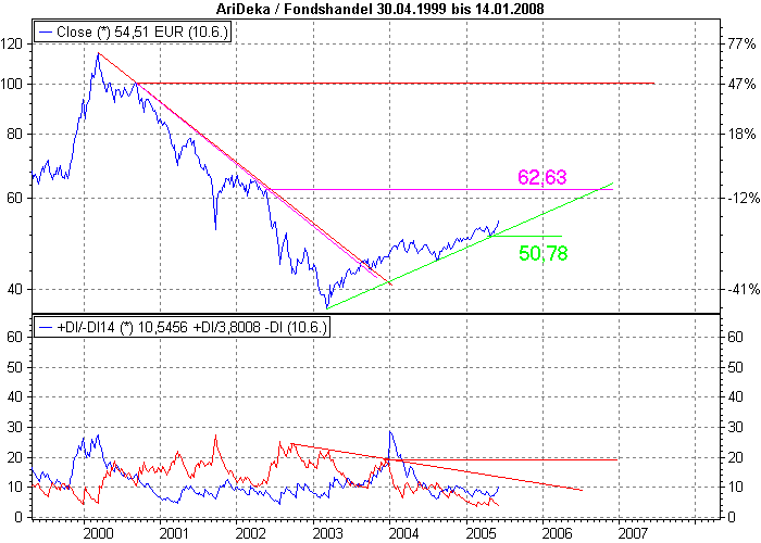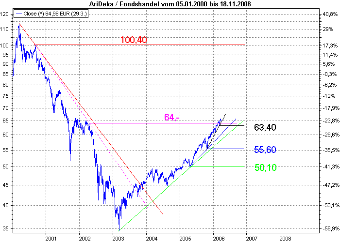 Aktiencrash März 30, 2006 Hier der Chart auf Tagesbasis. Ich wäre im Augenblick vorsichtig mit dem Einstieg, da der Fond an einem horiz. Widerstand (lila) angekommen ist. Ein SL unterhalb von 63,40 (horiz. Unterstützung) könnte sinnvoll sein. Bei einem Durchbruch durch diese Marke, könnte es im ungünstigsten Fall bis zur nächsten horiz. Unterstützung von 55,60 gehen. Diesen Beitrag teilen Link zum Beitrag