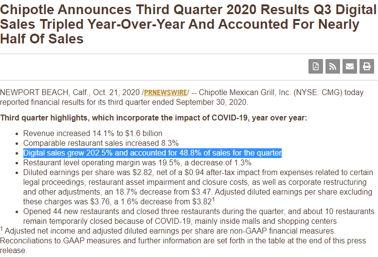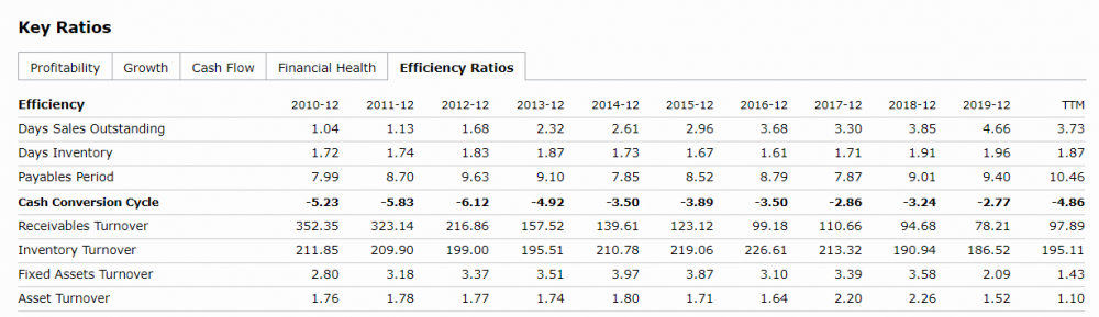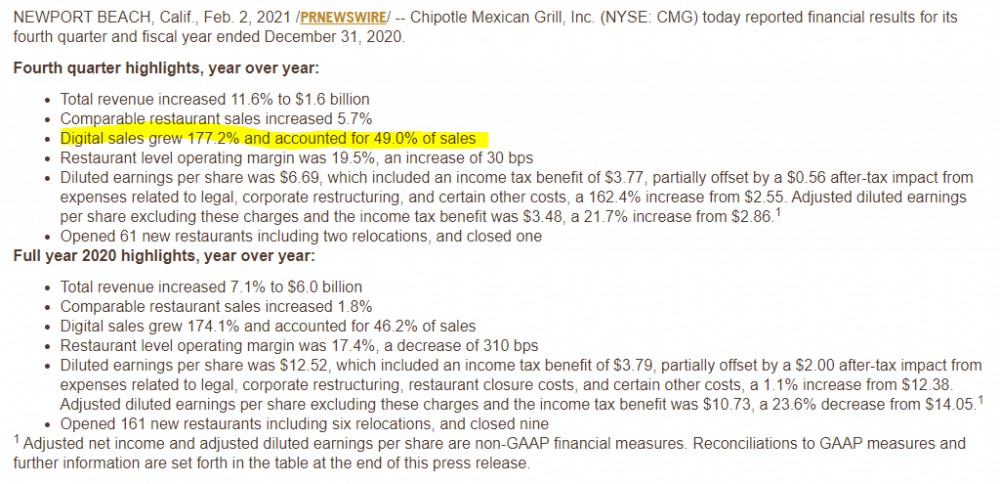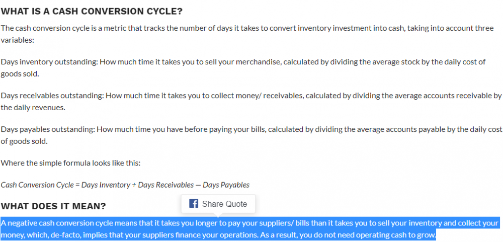 herbert_21 Februar 5, 2021 Chipotle ist ja die par-excellence Turnaround Story von Bill "Hell is coming" Ackman. Ich kann mich noch genau an seine beiden Auftritte in CNBC erinnern, wo er immer am Ende des Interviews für die Aktie warb. Auf Morningstar habe ich erst suchen müssen, was denn so toll an Chipotle, sei, denn die Gross Margin, das Wachstum, RoA etc. sind es nicht. Das Operating Cash Flow auch nicht. Und ich bin fündig geworden. Der Cash Conversion Cycle ist negativ: Was bedeutet das? A metric that compares the amount of days it takes a company to sell inventory and collect receivables relative to the amount of days afforded to pay bills. Quartalsergebnis vom 2. Februar 2021 Quartal davor: Restaurant level operating margin = 20% heißt: Für jede investierte $100 macht man 20$ Gewinn, und zwar jedes Jahr. Eine Cashdruckmaschine reinsten Wassers. Diesen Beitrag teilen Link zum Beitrag