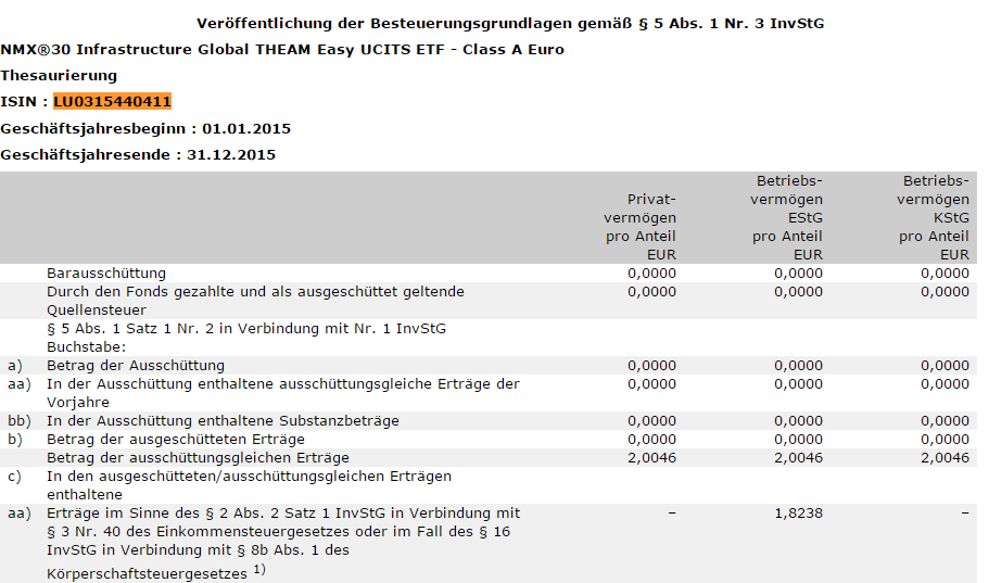 otto03 Mai 1, 2016 Hallo zusammen, ich versuche gerade für einen ausländischen ETF die Ertragsthesaurierung in der Steuererklärung für 2015 anzugeben. Hierbei handelt es sich um den NMX30 INFR.GL.TEAM EO A (LU0315440411), der Anfang dieses Jahres mit dem BNP Paribas Easy NMX30 INFR.GL.(LU1291109293) zusammengelegt, verschmolzen wurde. Leider finde ich weder für den 'alten' NMX30 noch für den Nachfolge-ETF im Bundes- anzeiger die Besteuerungsgrundlagen für 2015. Bringe ich zu wenig Geduld mit bzw wie gelange ich zu den relevanten Steuerdaten? Danke u Gruß RainerB für den neuen gibt es selbstredend noch nichts Diesen Beitrag teilen Link zum Beitrag