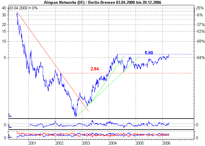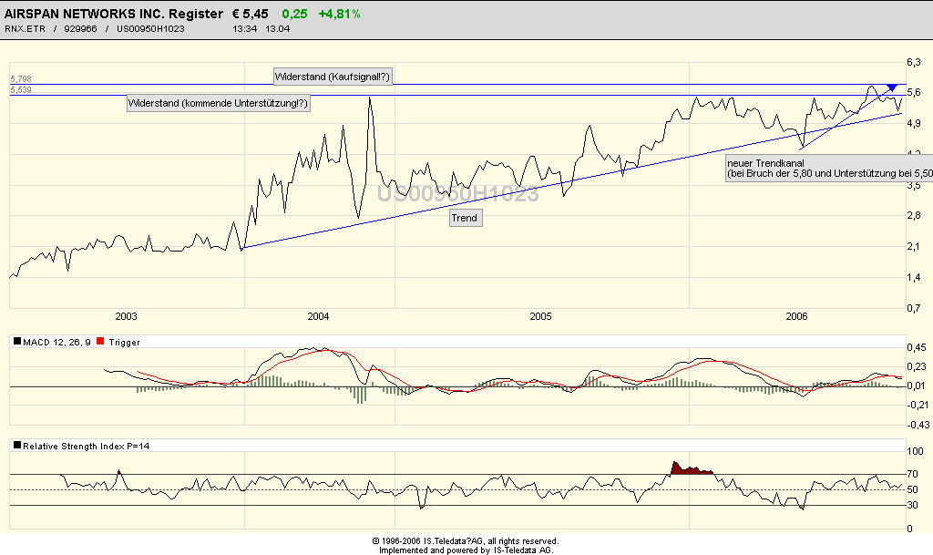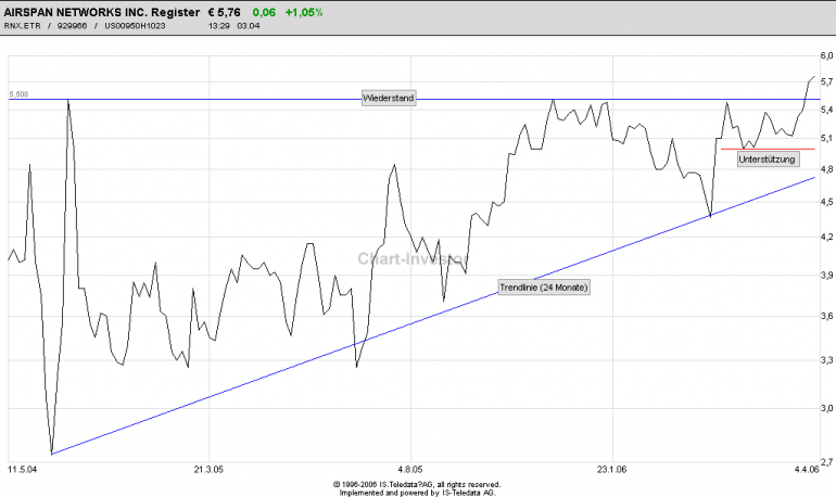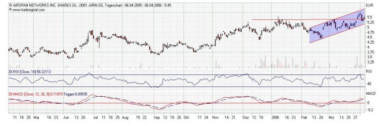 Spoeki April 3, 2006 Hallo zusammen! Was haltet Ihr von Airspan!? Habe mich heute mal an der Chartanalyse versucht (leider bekomme ich zur Zeit das Buch von Murphy nirgends, daher fehlt mir noch ein wenig der Hintergrund), aber seht selbst! Ich bin Anfänger und von daher dankbar, für jede konstruktive Kritik! Also pflügt meine Analyse ruhig auseinander!!! Aus meiner Sicht hat sie bei 5,- eine solide Unterstützung und nun den Wiederstand aus zwei Jahressicht durchbrochen! Auch der Trend der letzten 24 Monate hält an. Das Unternehmen ist z.Zt. in den roten Zahlen und erwartet für 2006 einen Umsatzplus von 40%, was den Turnaround in die schwarzen Zahlen bedeuten würde. Die Auftragslage ist sehr gut! Ich beabsichtige einzusteigen, mit 9-12 Monate Depotverbleib! Was meint Ihr!? Gruss Spoeki Diesen Beitrag teilen Link zum Beitrag