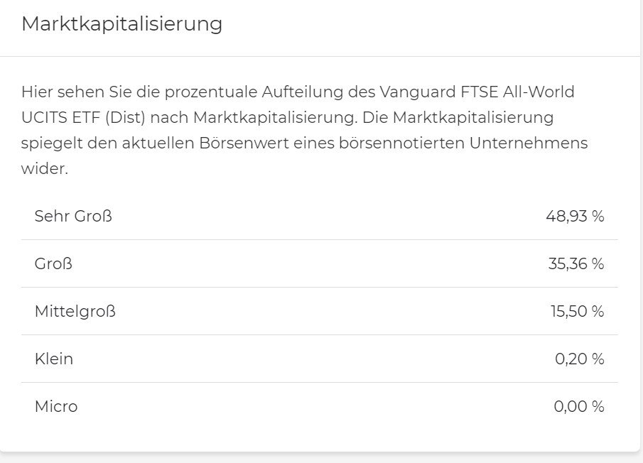 Peter23 April 16, 2021 · bearbeitet April 16, 2021 von Peter23 vor 22 Minuten von vanity: Hat der FTSE All World nicht sogar ein paar SC nach MSCI-Logik mit dabei, die Größeren der Kleineren? Und die Kleineren der Kleineren mit ihren 0,0x% Anteil haben ja bekanntermaßen keinen Einfluss auf die Performance (sondern nur auf die TD, weil sie so schwer beschaffabr sind). Doch klar - ca. 5%. Vermutlich sind sogar effektiv mehr % SC im Vanguard als im SPDR, weil der Vangaurd ja auch wirklich die Aktien des Index kauft. Diesen Beitrag teilen Link zum Beitrag