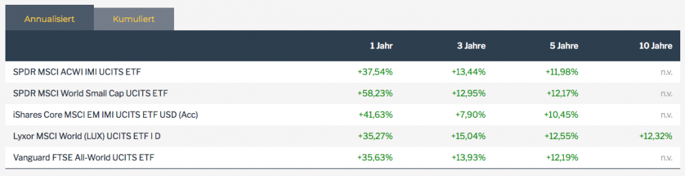 Peter23 April 18, 2021 · bearbeitet April 18, 2021 von Peter23 Ach Du meinst wahrscheinlich, dass ich einfach die 3-Jahres-Renditen gewichten kann. Das sind aber auch andere ETFs, als jene die ich oben verwendet habe. Ich nehme mal lieber die gleichen, damit es besser passt: https://www.fondsweb.com/de/vergleichen/tabelle/isins/IE00B3YLTY66,IE00BKM4GZ66,LU0392494562,IE00BCBJG560 Wenn ich meine Excel-Tabelle damit erweitere, dann kommt folgendes raus (links weiter die TDs, rechts die annualisierte 3-Jahres-Rendite): Diesen Beitrag teilen Link zum Beitrag