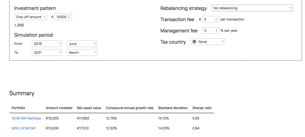Peter23 April 18, 2021 vor 1 Minute von Madame_Q: Hier die Fonds zumindest die letzten zwei Jahre zurück: https://www.fondsweb.com/de/vergleichen/tabelle/isins/IE00B3YLTY66,IE00B4L5Y983,IE00BF4RFH31,IE00BKM4GZ66 Wenn du magst (ich bin gerade unterwegs), darfst du gerne mal mit deinen Gewichtungen nochmal vergleichen (Performance und max. DD etc). Wo kann ich denn dort eine Gewichtung eingeben? Diesen Beitrag teilen Link zum Beitrag