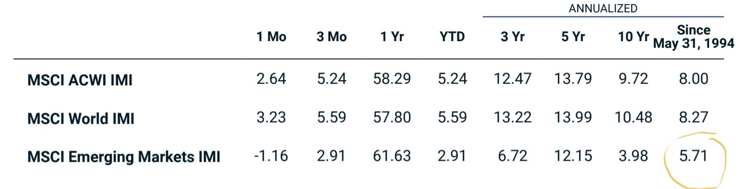 Madame_Q April 18, 2021 · bearbeitet April 18, 2021 von Madame_Q Am 17.4.2021 um 14:36 von Madame_Q: und hier: Ist zwar nicht ganz Hauptthema, aber einen Datensatz wollte ich noch ergänzen, wenn er schon da ist. Das an alle, die denken, dass Emerging Markets auf lange Sicht recht sicher mehr Rendite bringen: Mich hat es zugegeben auch sehr überrascht. Es sind immerhin 27 Jahre (mehr Volatilität/Drawdown/weniger Rendite). Nicht jedes höhere Risiko zahlt sich aus, selbst nicht auf lange Sicht). Für die Small Caps (World) finde ich bei MSCI leider nur Daten bis 2000 und nicht bis 1994. Wäre auch interessant. Diesen Beitrag teilen Link zum Beitrag