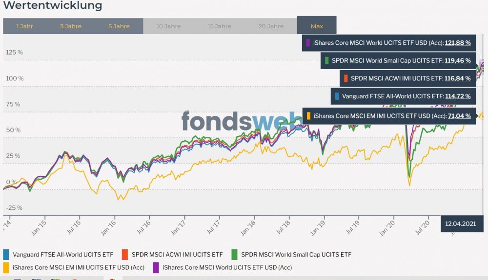 Madame_Q April 18, 2021 · bearbeitet April 18, 2021 von Madame_Q vor 38 Minuten von Peter23: Wenn man jetzt neu investiert, dann würde ich auch zum iShares MSCI World Small Cap greifen. Ich wollte nur eben im Vergleich etwas nehmen, was man damals (insbesondere 2016) auch ausgewählt hätte. Ist ok. Ich hab es jetzt mal auch durchgerechnet mit diesen ETFs und der maximal möglichen Zeit (knapp 7 Jahre). Ich habe die kumulierte Performance berechnet und den max. DD in der Corona-Krise letztes Jahr. https://www.fondsweb.com/de/vergleichen/tabelle/isins/IE00B3YLTY66,IE00BCBJG560,IE00BKM4GZ66,IE00B4L5Y983,IE00B3RBWM25 Meine Ergebnisse: Performance Eigenbau: 121,1 % Performance 1-Fonds-Lösung (SPDR ACWI IMI): 119,5% Max DD Eigenbau: 35,34% Max DD 1-Fonds-Lösung (SPDR ACWI IMI): 34,70% Übrigens noch zur Gaudi dazu der Vanguard All World: 114,72% Performance 33,71% max DD Das kann jetzt jeder selbst beurteilen, was er damit anfängt. Für mich bestätigt es, dass der Eigenbau (wie so oft) weniger bringt, als man sich erwartet/erhofft. Ob man nun mit dem Eigenbau (und das hattest du ja oben erwähnt) wirklich exakt die Zielgewichtung des ACWI IMI Index trifft, weiß ich nicht, aber ich bezweifle es einfach mal wie du auch oben (mir wäre es sowieso egal, wie du mich kennst - ich würde wohl sogar einfach 70/15/15 machen, wenn ich Eigenbau machen würde). Wenn einen das aber nicht stört, dass man mit dem Eigenbau minimale Abweichungen haben kann, dann verstehe ich nicht, wieso einen die ebenso minimalen Abweichungen des SPDR ACWI IMI stören sollten. Diesen Beitrag teilen Link zum Beitrag