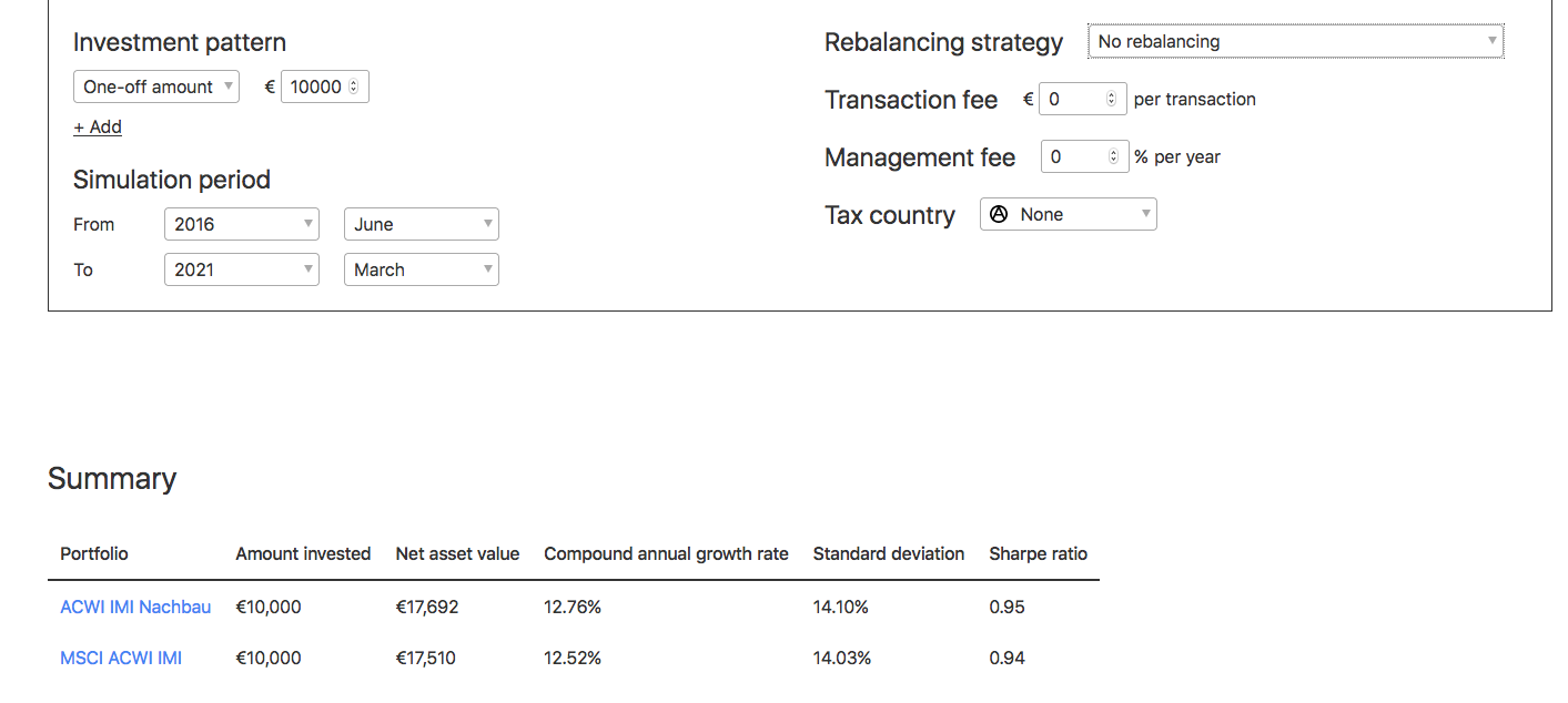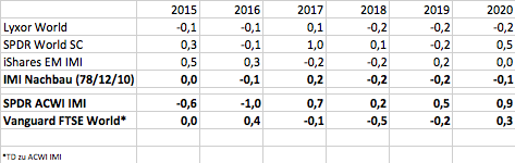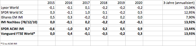 Peter23 April 18, 2021 · bearbeitet April 18, 2021 von Peter23 Ich habe mal eine 3-ETF-Lösung zum Nachbau des SPDR ACWI IMI "quick and dirty" analysiert (bitte beachten, dass die Seite nur die Indizes, aber nicht die ETFs selbst abbildet). Dazu habe ich folgende Aufteilung verwendet: Am 19.6.2016 um 10:40 von xfklu: MSCI ACWI IMI = 78.1% MSCI World 12.1% MSCI World Small Caps _8.5% MSCI Emerging Markets _1.4% MSCI Emerging Markets Small Caps Weil bei backtest.curveo.eu nur ganzzahlige Prozentsätze möglich sind, habe ich das dann folgendermaßen aufgeteilt: - MSCI World 78% - MSCI EM IMI 10% - MSCI World SC 12% Die Ergebnisse sehen folgendermaßen aus: Die Simulationsperiode habe ich bewusst von 2016 Juni gewählt und ohne Rebalancing (was mE auch kaum notwendig ist), weil ja auch die Aufteilung von diesem Datum stammt. Weiß jemand, wo man die genaue Aufteilung historisch herbekommen könnte? Zudem habe ich mir TDs angeschaut. Hier sollte man beachten, dass die gewissermaßen mit Rebalancing sind, weil ich einfach die einzelnen TDs mit 78/12/10 gesichtet habe, aber man sieht mE schon recht deutlich, dass das kaum was ausmacht, weil die TD natürlich sowieso hauptsächlich vom World geprägt ist (wegen den 78%): Mein persönliches Fazit: - Mir gefällt an dem Nachbau, dass man offensichtlich im Ergebnis (also gewichtet) sehr niedrige und kaum schwankende TDs hat. - Außerdem kann man für 78% des Portfolios frei wählen zwischen verschiedenen MSCI Worlds (z.B. Swap, replizierend, bestimmte Anbieter (ggf. zur Anbieter Diversifikation), verschiedene Domizile) - Ein Nachteil könnte man darin sehen, dass die Gewichtung den Index in manchen Jahren vielleicht nicht 100%ig (sondern nur 99,5%ig) widerspiegelt. Hier sehe ich aber kein großes Problem, weil man dadurch entweder eine ganz leicht höhere Volatilität bei höherer Renditeerwartung bekommt (z.B. bei mehr Small Caps) oder leicht niedrigere Volatilität bei niedrigerer Renditeerwartung (z.B. bei weniger Small Caps). Außerdem wie gesagt: Das sind in der Praxis sowieso nur Nuancen bzw. muss man in der Realität ja nicht auf ganzzahlige Prozentwerte runden. - Wenn man es möchte, kann man mit dieser Variante auch einen höheren Small Cap-Anteil oder EM-Anteil realisieren. Das geht natürlich auch mit dem SPDR ACWI IMI, wenn man noch mehr ETFs dazu kauft. Dann würde aber der einzige Vorteil des SPDR (nur 1-ETF) verloren gehen, aber seine Nachteile bestehen bleiben. Daran kann ich vielleicht auch nochmal darlegen, was mir am SPDR ACWI IMI nicht gefällt. Er besteht zu 78% aus dem MSCI World und schwankt in der TD trotzdem eher wie ein ETF auf exotische Indizes wie EM Small Cap. Ich finds dann besser lieber die 78% durch einen der sehr, sehr guten ETFs auf den MSCI World abzubilden und nur bei den restlichen 22% auf kleinere und stärker schwankende gehen zu müssen. Für jemanden, der nur einen ETF möchte, und trotzdem unbedingt mehr als 90% der MCap abdecken möchte, ist aber der SPDR ACWI IMI eine gute Lösung. Diesen Beitrag teilen Link zum Beitrag