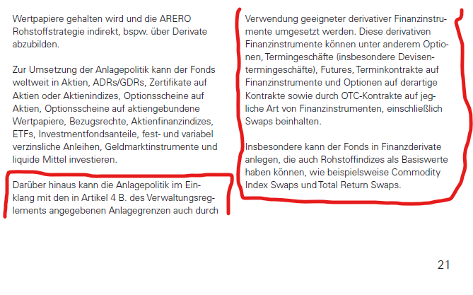 Rendito April 22, 2021 vor 11 Stunden von Madame_Q: Danke für die gute Erklärung. Gerne. Falls Du das Derivaterisiko mal beim ARERO überprüfen möchtest: die relevanten Angaben finden sich verstreut im aktuellen Verkaufsprospekt (einfach mal "Derivat" als Suchbegriff im Dokument eingeben). Soweit ich es sehe hält sich das Fondsmanagement alle Möglichkeiten im gesetzlichen Rahmen offen, wenn auch mit gewissen Anlageobergrenzen. Speziell für die Rohstoffkomponente bleibt ihm auch wenig anderes übrig. Der Rahmen wird auf S. 21 gesteckt: Schaut man in den letzten Halbjahresbericht 2020 (wann kommt der Jahresbericht?), so wird als einziges Derivat am Bilanzstichtag auf S. 39 ein Total Return Swap auf den Bloomberg Commodity Index ausgewiesen. So weit, so nachvollziehbar. Hoffentlich löse ich damit jetzt keine neue AA-Diskussion im Hause Q aus ... Diesen Beitrag teilen Link zum Beitrag