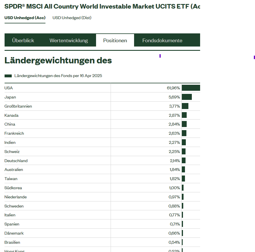 Sorry, ich hatte die falsche Erinnerung, dass USA lange deutlicher über 60% lagen. Da hat mich wohl die Hysterie über ein USA-Kumpenrisiko in die Erinnerungs-Irre geleitet. Habe aber gerade ein Facsheet von 12/'22 gefunden. Da war USA sogar nur bei 59,38%.