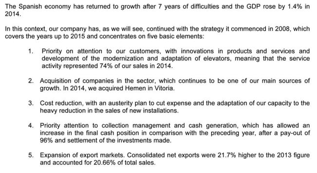 Die Marge von Zardoya Otis ist besonders stark, weil 74% des Umsatzes aus dem Wartungsgeschäft kommen. Zardoya wartet 280.0000 Einheiten. Diese Zahl wuchs - bis auf 2014 - jedes Jahr. Die Mitarbeiterzahl konnte trotz dessen reduziert werden. Hier ein Auszug aus dem GB: