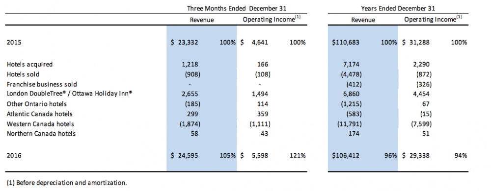 • Das EBITDA blieb mit CAD 29,3 Nio. umsatzgetrieben ebenfalls unter unseren kfr. Erwartungen von CAD 33 Mio.. In den Drei-Monatszahlen für Q4 kann man jedoch feststellen, dass sich eregbnisseitig bereits eine Trendwende abzeichnet. Das EBITDA konnte bei einem Umsatzanstieg von rd. 5% um rd. 21% gesteigert werden. Dies verdeutlicht, dass sich bereits geringfügige  Umsatzsteigerungen aufgrund des guten Kostenmanagements überproportional auf das Ergebis niederschlagen. Haupttreiber waren in Q4 die renovierten Hotels in London, Ontario und Ottawa.
