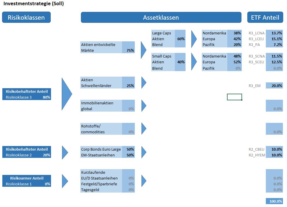 jphdxb August 9, 2016 · bearbeitet August 10, 2016 von jphdxb Hallo liebe Forum Mitglieder, Seit Monaten stöbere ich nun schon durch dieses tolle Sammelsorium an Fachwissen und Meinungen hier im Forum, und muss wirklich sagen, dass es mir wahnsinnig geholfen hat. Vielen Dank schon mal vorab! Nun wuerde ich gerne euer Feedback und Rat haben bevor ich meine ETF Strategie umsetze. Über meine Person Pflichtangaben: 1. Erfahrungen mit Geldanlagen Zeitlich gesehen seit 20 Jahren, aber weniger aktiv. Selektive Aktien und Fonds, aber eher Tagesgeld. Umstieg auf ETFs erst jetzt, nach Kommer Lektüre. 2. Darstellung von bereits vorhandener Fondspositionen (Fondsbezeichnung und ISIN angeben): Keine. Ca. 20 einzelne Aktienwerte in kleinen Positionen. Plane diese aufzulösen. 3. Zeitliche Aufwandsbereitschaft für eure Fondsanlage: Zeit und Interesse besteht, aber nicht aktives Handeln. Denke so 1-2 Stunden im Monat. 4. Risikotyp/Risikobereitschaft/Umgang mit Verlusten: Augenmerk auf Rendite, Verlustrisiko bis 50%, langfristig ausgerichtet. Passives investieren. Optionale Angaben: 1.Alter: 41 2. Berufliche Situation: Leitender Angestellter, Steuerausländer auf unbestimmte Zeit Über meine Fondsanlage Pflichtangaben: 1. Anlagehorizont Sehr langfristig, bis zur Rente. 2. Zweck der Anlage Altersvorsorge. Evtl. Finanzielle Freiheit wenn möglich. 3. Einmalanlage und/oder Sparplan? Einmalanlage möglich, bevorzuge aber Sparplan wg. cost average. 4. Anlagekapital: 100k Euro als 12-monatiger Sparplan, danach mtl. weiter. Chart 1: Geplante Investmentstrategie zu Beginn (abgeleitet v. Kommer 2015 und inspiriert von Supertobs) Tabelle 1: Geplante ETF Auswahl (grün hinterlegt, Optionen in grau) Erklärung: 1-2: Risikoklasse & Identifier 3-11: ETF Kennungen 12: Thesaurierend/Ausschüttend 13: Steuereinfach ja/nein 14: Total Expense Ratio % 15: Domizil IR - Irland, DE - Deutschland, LU - Luxemburg 16: Durchschnitts-TD (laut Holzmeier) 18: Bewertung 1-5 Sterne nach TrackInsight (basierend auf TD, TE, Hurst, Kurtosis) 19: Bewertung FinanzTest 1-5 Punkte Auswahl-Kriterien der ETFs: Zero cost Sparplan bei Flatex Performance, Größe, Bewertung Ausgewogen bzgl. Anbieter und Replikation Bevorzugt physisch, thesaurierend, steuereinfach. Wegen einer hohen bestehende Tagesgeld-Position, vernachlässige ich vorerst den RK1 Aufbau und konzentriere mich auf RK2 und RK3. Ich plane 100k Euro über 12 Monate in die ausgewählten ETFs zu investieren. Der RK1 Anteil wird weiterhin über bestehende Tagesgeldvermögen repräsentiert. Ich möchte direkt mit einer 6er-Aktien ETF Diversifizierung beginnen, da ich die Transparenz und Auswahlmöglichkeit trotz höherem Arbeitsaufwandes (rebalancing, tracking) schätze. Danke für die Kommentare, jphdxb edit [10/08/16] adjusted balance, added IE00B2NPKV68 Diesen Beitrag teilen Link zum Beitrag