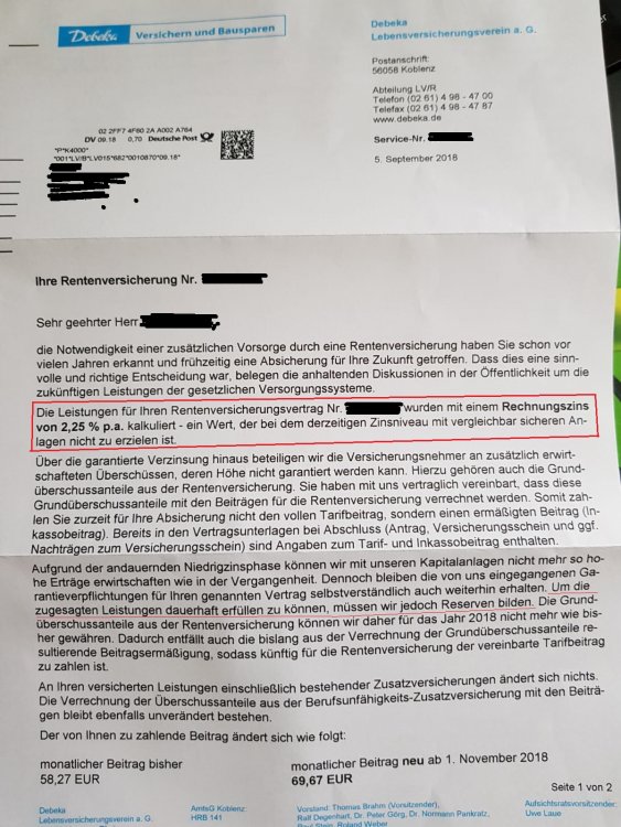 B2BFighter September 14, 2018 vor einer Stunde schrieb Studi24: https://www.policendirekt.de/magazin/solvenzquoten-und-pflichtberichterstattung-der-deutschen-lebensversicherer/# Da kann jeder seine eigenen Schlüsse draus ziehen. Fakt ist, Marktgröße schützt nicht vor Problemen. Danke für den Link. vor 17 Minuten schrieb DrFaustus: Das würde ich so nicht stehen lassen. Ich würde sagen: Sie erwirtschaftet nicht genug um die vorherige Reduzierung der Beiträge aufrecht erhalten zu können. Wenn sie 2,25% garantiert hat, muss das auch einfließen. Wenn sie vorher mit 4% kalkuliert hat und jetzt nur noch 3% schafft, müssen die Beiträge trotzdem angepasst werden. Das ist halt die Preisfrage, wie hoch die Überschüsse der Debeka überhaupt noch sind. Im Gegensatz zu der Garantieverzinsung ist die Überschussbeteiligung nicht garantiert und hängt im Wesentlichen vom Anlageerfolg der Debeka ab. Die Verwendung der Überschüsse war– wie bisher im Vertrag – durch die Beitragsermäßigung bei Vertragsabschluss vereinbart worden. Es kam also so zu einer Sofortverrechnung mit den vereinbarten Vertragsbeiträgen. Hier wurde der Zahlbeitrag mit und ohne Gewinnbeteiligung ausgewiesen. Wobei mir klar ist, dass der Beitrag mit der Beteiligung nur für das laufende Geschäftsjahr garantiert werden konnte. Nun ist der ungünstigste Fall eingetreten, es entfällt die Verrechnung, da keine Überschüsse ausgewiesen werden und der im Versicherungsvertrag maximale Bruttobeitrag ist zu zahlen ist. Theoretisch könnten die Überschüsse bei der Debeka auch unter 2,25% liegen. Das kann man aber nur genau wissen, wenn Versicherte mit einem Garantiezins von 1,75% (seit 01.01.2012) dieses Schreiben ebenfalls erhalten haben. Diesen Beitrag teilen Link zum Beitrag