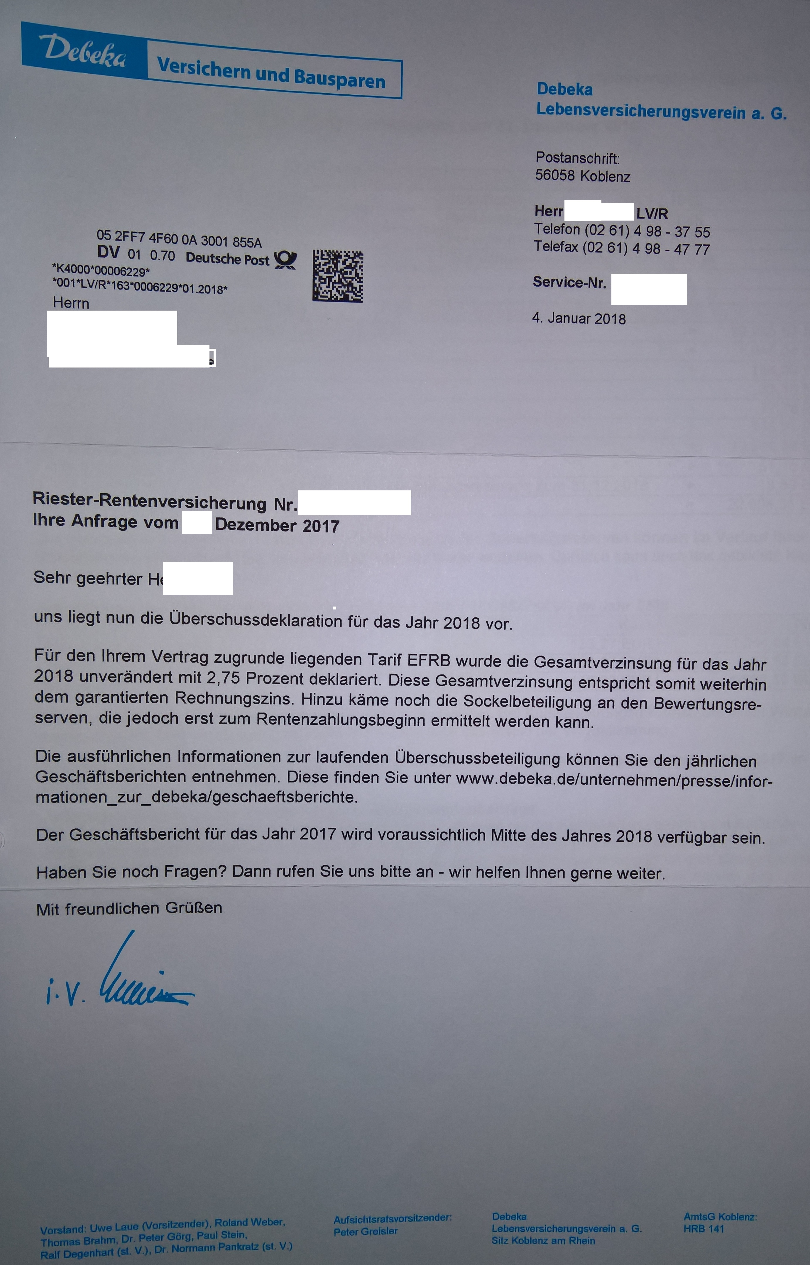 B2BFighter November 28, 2018 Am 20.11.2018 um 18:31 schrieb Finanz: Das von der Debeka zitierte Urteil vom LG Köln ist ja ganz offensichtlich auch nur ein Einzelfall und noch dazu einer, der den Sachverhalt deutlich weniger trifft als beim Urteil des Amtsgerichts Bamberg, weil es da genau um die Problematik bei der Riester-Rente ging und nicht um Sonderzahlungen zur Rürup-Rente wie Nostradamus schon geschrieben hat. Wenn die Debeka das Riester-Urteil als so falsch angesehen hätte, dann hätte sie ja die Möglichkeit gehabt das Urteil anzufechten. Ein höheres Gericht kann auch nur beurteilen, was vertraglich geschlossen wurde nach BGB. Und wenn da ein vertragsbezogener Garantiezins versprochen wird in den Vertragsbedingungen und Unterlagen der Debeka, dann muss dieser eben auch für vereinbarte Erhöhungsbeiträge gezahlt werden. Auch wenn es nach dem VVG grundsätzlich eine Anpassungsmöglichkeit des garantierten Rechnungszins für die Versicherung gäbe. Mit dem niedrigen Zinsniveau hat die Debeka meiner Meinung wohl einfach nicht gerechnet und versucht jetzt mit der Anwendung eines niedrigeren Rechnungszinses durch die schwammige Formulierung in den Verträgen, dass sich die Versicherungsleistung "zum jeweiligen Erhöhungstermin gültigen Tarif" berechnet, Geld einzusparen. Ich weiß übrigens von einem Bekannten, der exakt das gleiche Schreiben wie SkyWalker auf seine private Beschwerde bekommen hat. Er hat dann den gleichen Rechtsanwalt genommen, der das Urteil des Amtsgerichts Bamberg erstritten hat, und mittlerweile hat die Debeka auch bei ihm den vereinbarten Garantiezins für die gesamte Vertragslaufzeit seiner Riester-Rente gewährt sowie auch die Rechtsanwaltskosten erstattet als es Richtung Klage ging. Anscheinend macht sie das aber leider wirklich erst auf größeren Druck bei denen, die wirklich klagen würden. Ich hoffe dann mal, dass das bei dir auch klappt ohne bis zum Äußersten gehen und klagen zu müssen, Skywalker. Die Thematik wird sich wohl insgesamt wirklich nur mit einer Mustersammelklage klären lassen, weil die Debeka versucht die wenigen Leute, die sich ernsthaft beschweren, mit ihren selbstsicheren Schreiben abzuwimmeln und wenn doch jemand klagen will, dann wird vorher eingelenkt oder die Klage akzeptiert und das Urteil klein gehalten, damit es kein höherinstanzliches, bindendes Urteil gibt, das für die Debeka nachteilig wäre. Ich habe mal mein Antwortschreibend er DEBEKA vom Januar 2018 heraus gesucht. Hier bestätigte mir die Debeka, dass alle in 2018 eingezahlten Beiträge genau wie die alten vor 2018 mit dem Rechnungszins von 2,75 % in 2018 verzinst werden. In meiner Anfrage bat ich um Bekanntgabe der laufenden Überschussbeteiligung für 2018, da diese von der Debeka nicht mehr veröffentlicht wird. Mein Glück war, dass ich vor dem 01.01.2017 dein Eigenbetrag auf den Höchstbeitrag (damals 162,17 €) nach § 10a EStG angehoben habe per monatlichen Dauerauftrag. Inzwischen überweist mir die Debeka jeden Monat 1,75 € zurück, da sie nur noch 160,42 € Eigenbeitrag gestattet und hat mich nun aufgefordert meinen Dauerauftrag entsprechend zu senken. Diesen Beitrag teilen Link zum Beitrag