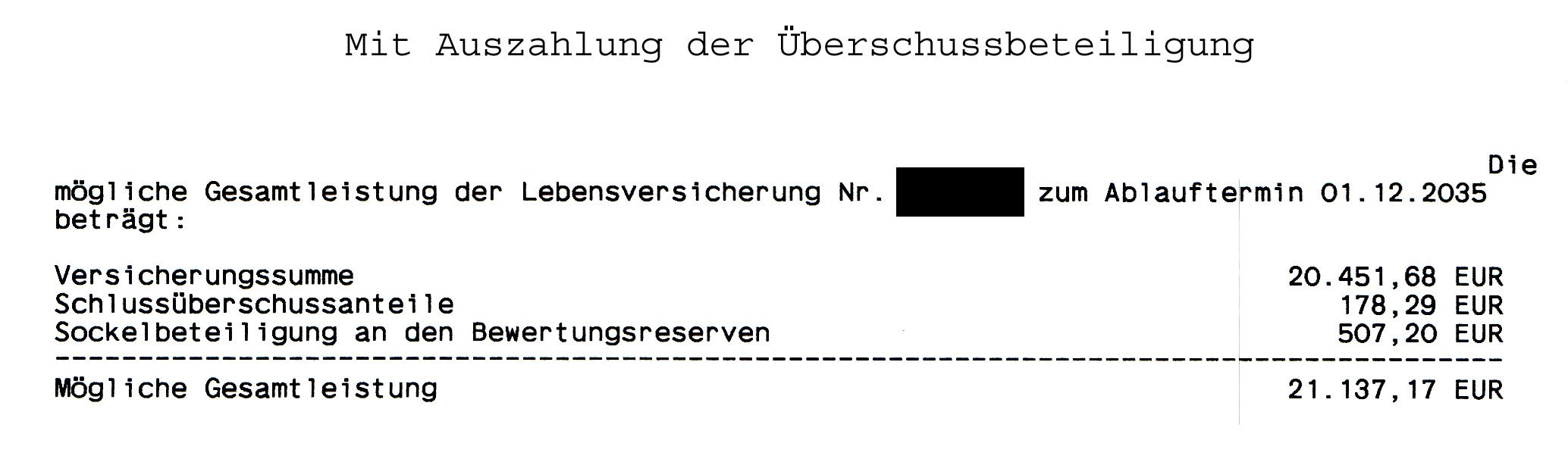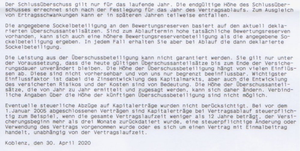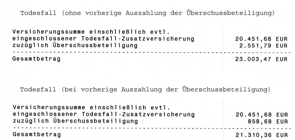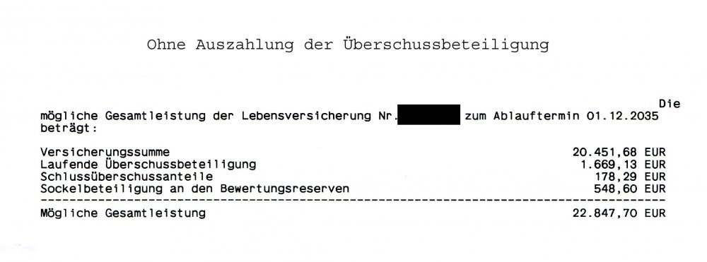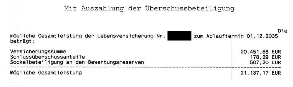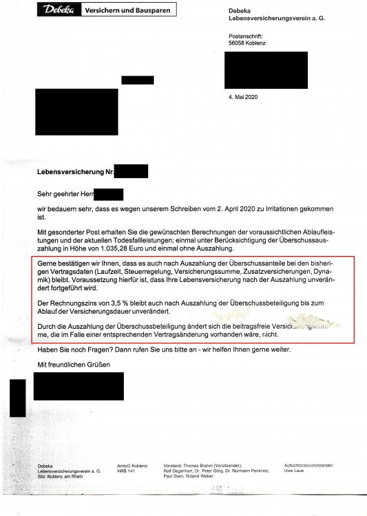 Holgerli Mai 9, 2020 · bearbeitet Mai 9, 2020 von Holgerli So, hier nun die ausführliche Dokumentation der Antwort der Debeka: Anschreiben: Das Wichtigste ist durch mich rot eingerahmt. Dem entnehme, dass bis auf die entnommene Überschussbeteiligung alles gleich bleibt. Keine späteren Nachteile durch mich. Hier die Rechnungen: Der Vertrag endet regulär Ende 2035 und wird ausgezahlt. Einmal ohne vorherige Auszahlung der Überschussbeteiligung und einmal mit: vs. Die Differenz bei der Auszahlung beträgt somit bei 1.710,53 Euro. Minus der ausbezahlen 1.035,28 Euro entsteht ein Diffenzbetrag von 675,25 Euro aufgrund der frühzeitigen Auszahlung. Was auffällt ist, dass sich auch der Sockelbetrag an den Bewertungsreserven um 41,40 Euro verringert. Diesen Wert habe ich aber schon eingerechnet. Unter beiden Berechnungen steht noch folgender "Disclaimer": Ich hoffe, dass da nicht noch was versteckt ist. Bei der vertragsgemäßen Auszahlung im Todesfall sähe die Rechnung so aus: Die Differenz bei der Auszahlung beträgt somit bei 1.693,11 Euro. Minus der ausbezahlen 1.035,28 Euro entsteht ein Diffenzbetrag von 657,83 Euro aufgrund der frühzeitigen Auszahlung. Diesen Beitrag teilen Link zum Beitrag