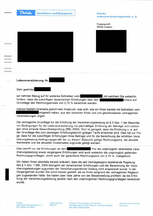 ufr Mai 10, 2020 vor einer Stunde von Ela20: Es wäre klasse, wenn du den Begründungstext einstellen könntest. Mein Widerspruch bei der Riesterrente wurde ja u.a.mit Hinweis auf Paragraph 7 ABAVV 2006 zurückgewiesen. Eine Lebensversicherung habe ich aber auch noch bei der Debeka. Hier finde ich in den Versicherungsbedingungen keine ähnlichen Regelungen und bin daher gespannt wie da die Begründung lautet. Das (anbei) war vor gut eineinhalb Jahren die Begründung der Debeka. Im Hinblick auf die desolate Lage der Debeka habe ich das Thema damals nicht mehr weiter eskaliert. Wenn ich mal Lust und Zeit habe, gehe ich das mit Ombudsmann/Anwalt vielleicht nochmal an... Am 9.5.2020 um 16:20 von Holgerli: So, hier nun die ausführliche Dokumentation der Antwort der Debeka: Vielen Dank fürs Einstellen! Dann ist das ja zumindest eine Rückfalloption für eine Teilentnahme, wenn sich die Lage der Debeka noch weiter verschlechtern sollte . Diesen Beitrag teilen Link zum Beitrag