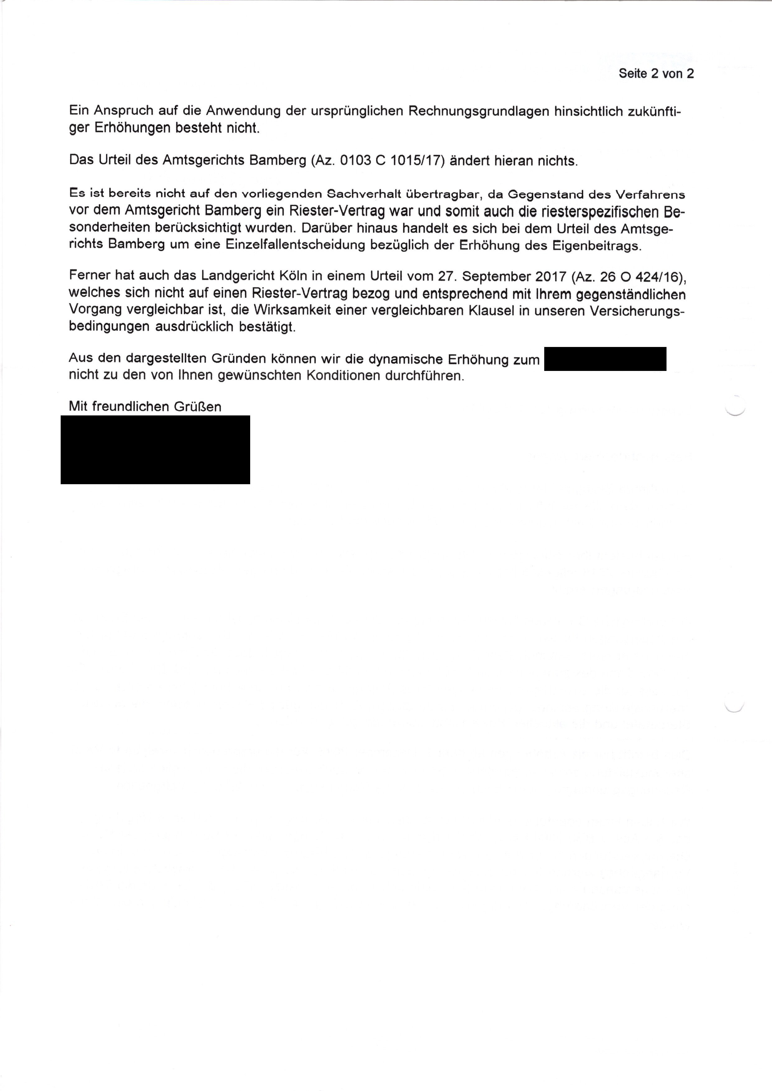 Ela20 Mai 9, 2020 Hallo! Ich habe mit großem Interesse eure Diskussion verfolgt, da ich selbst gleich doppelt von der Zinsherabsenkung der Debeka (bei Erhöhungen meiner Beträge) auf 0,9% betroffen bin: sowohl bei meiner Riesterrente als auch bei einer Lebensversicherung. Bei der Riesterrente habe ich ein ähnliches Antwortschreiben wie hier schon hochgeladen, erhalten. Natürlich will man meine Zinsen nicht wieder hoch setzen. Man beruft sich darauf , dass es sich um eine "Einzellfallentscheidung" des AG Bamberg handelte, dass gem. Paragraph 7 ABAVV eine Senkung zulässig wäre und dass es zwischenzeitlich noch ein weiteres Urteil und zwar vom Amtsgerichts Husum AZ. 27 C 140/19 gebe, laut Debeka mit "nahezu identischem Bedingungswerk", das zu Gunsten der Debeka ausging. Interessanter Weise habe ich nach intensivem Studium der Versicherungsbedingungen für die Lebensversicherung, in meinem Fall die ABL 2004, keinen Paragraphen ähnlich dem Paragraph 7 ABAVV bei der Riesterrente gefunden. Lohnt es sich daher bei der Lebensversicherung nochmal separat Widerspruch einzulegen (dann am besten gleich mit Anwalt)? Oder hat von euch schon jemand Antwort von der Debeka auf einen Widerspruch die Lebensversicherung betreffend erhalten? Hier wäre die Begründung interessant. Diesen Beitrag teilen Link zum Beitrag
