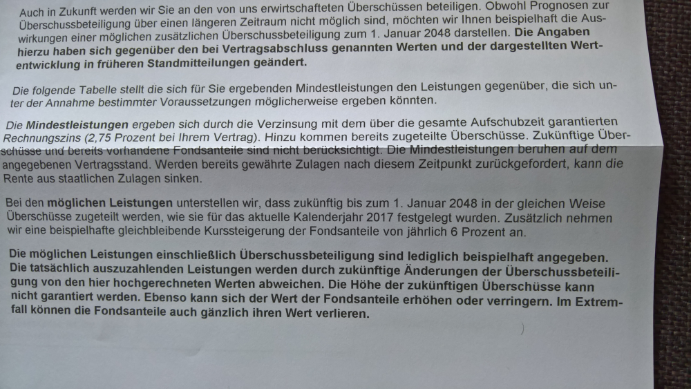 Sparkommissar März 16, 2017 Hier ist mittlerweile auch die Abrechnung eingetroffen. Auf mich trifft Variante 2 zu, sodass in den Dokumenten bzgl. der zukünftigen Wertentwicklung / den Mindestleistungen derselbe Passus wie bei B2BFighter enthalten ist. D.h. bei mir wird der Rechnungszins von 0,9% ebenfalls nicht erwähnt. Diesen Beitrag teilen Link zum Beitrag
