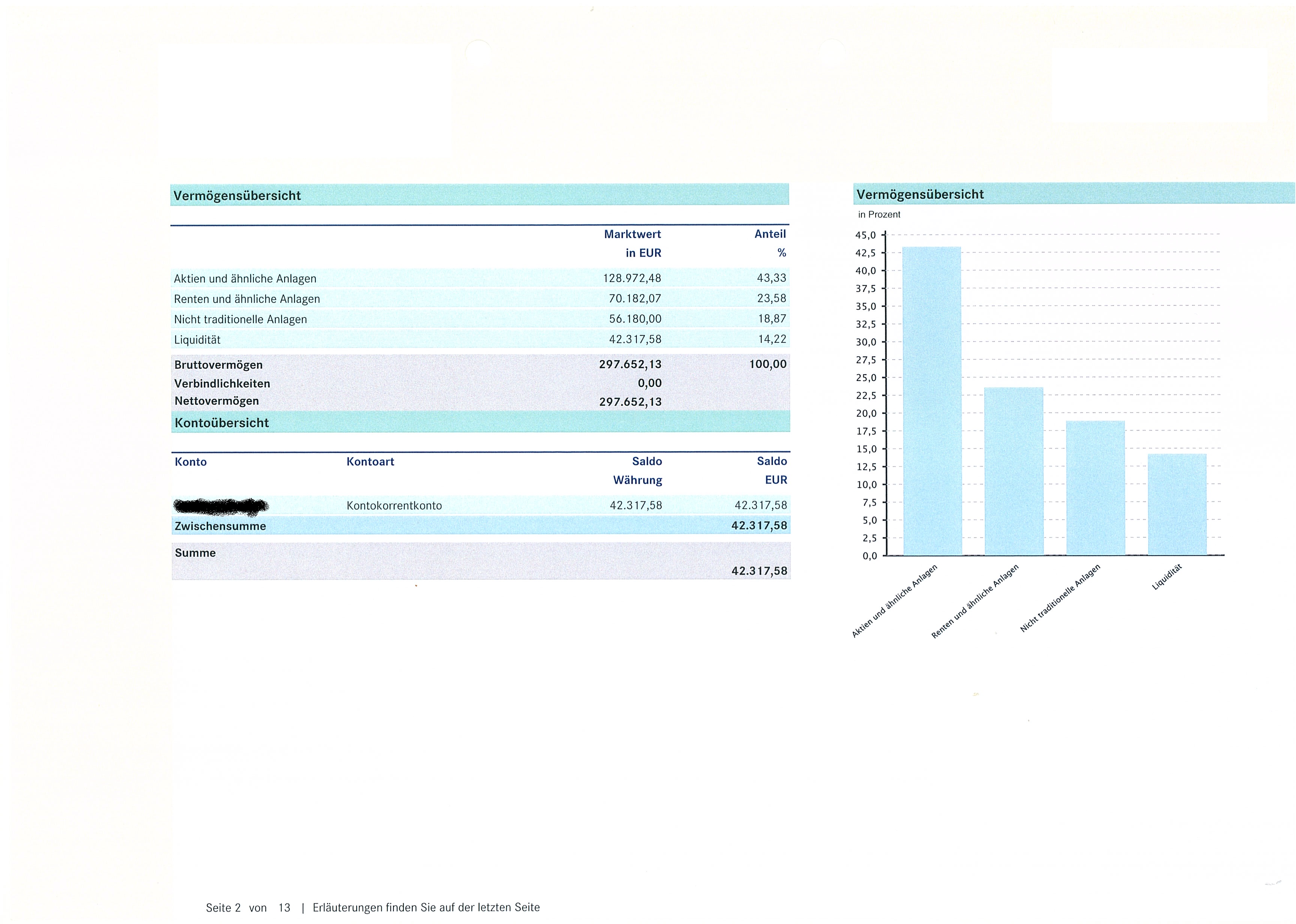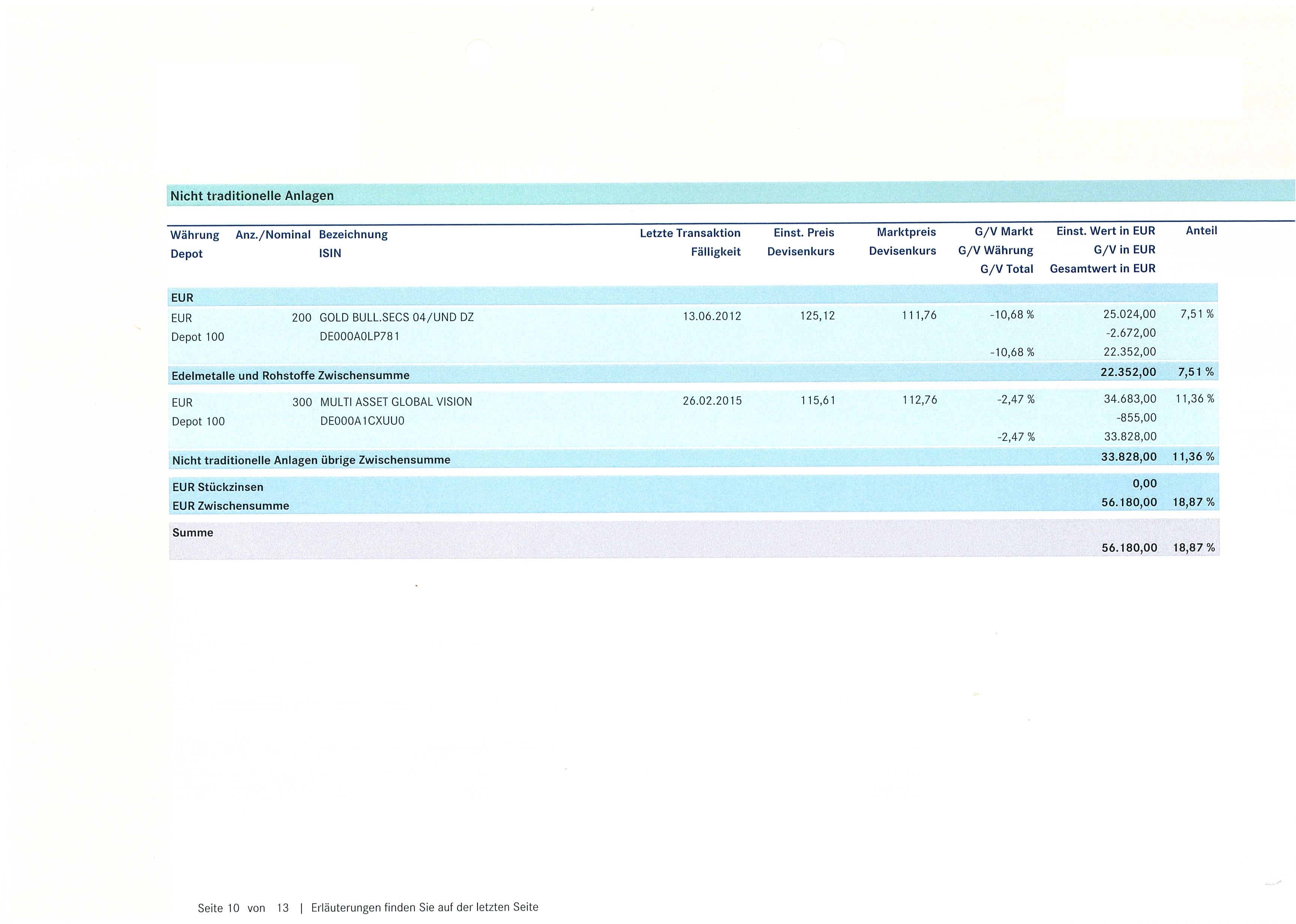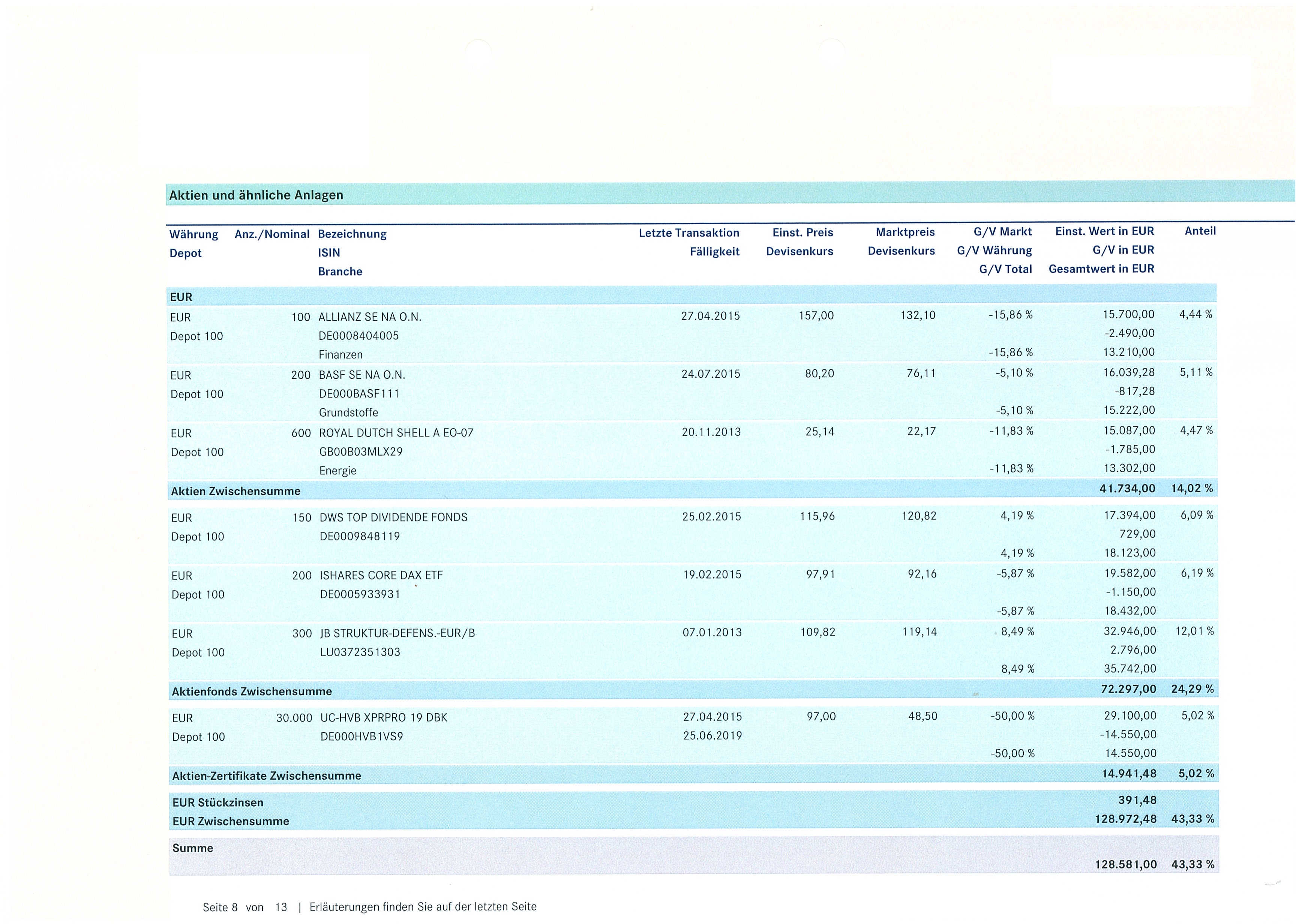 martinho92 Oktober 21, 2016 Hallo Leute, meine Mutter laesst bei einer Privatbank um die 300.000 Euro verwalten. Das Portfolio hat die letzten Jahre nur Verlust gemacht (Anfang 2014 lag der Gesamtwert bei 338k, in diesem Quartal waren es nur noch 297k. Deshalb hab ich mir gedacht, das Portfolio hier einfach mal aufzufuehren und Euch um Bewertung bzw. Ratschlaege zu bitten Diesen Beitrag teilen Link zum Beitrag
