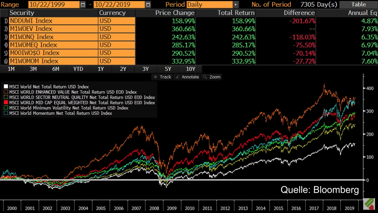 C-Dog Oktober 11, 2020 vor 2 Stunden von Barqu: Ich kenne leider keine gute Seite um einen Vergleich anzustellen und kann deinen Zahlen nicht ganz folgen, habe es nun aber spasseshalber mal bei extraetf eingetragen und bekomme dann nachfolgendes Bild: "20% Europa" fehlt aus C-Dogs Liste, aber man kann sich den EM IMI doppelt denken, denn die liegen sehr beieinander. Was ich - aber hier leider nur fuer 6 Jahre - sehe, bestaetigt meine Vermutung: Mit mehreren gegenlaeufigen Faktoren landet man gemittelt bei dem Index, der alle Faktoren enthaelt: einem stinknormalen All-World. Hier mal ein etwas längerer Zeitraum von 20 Jahren (in USD): (Quelle: https://www.youtube.com/watch?v=PbbjVNgtPqY bei 6:50) Da sieht es schon anders aus. Diesen Beitrag teilen Link zum Beitrag